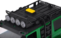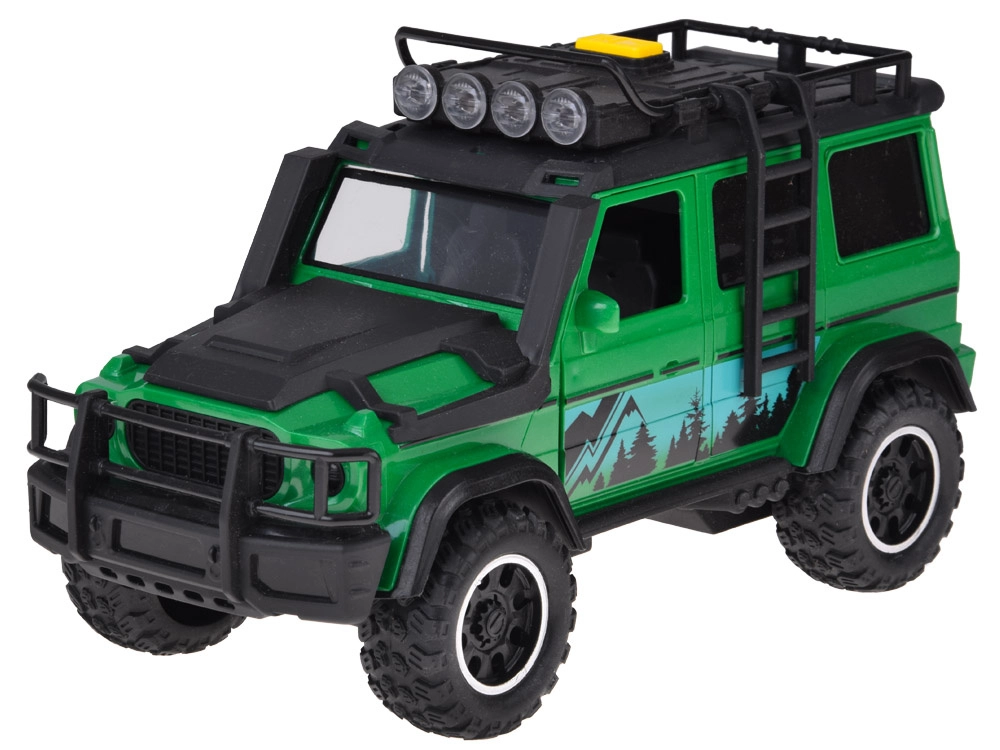 Dodies bezceļos! Šis detalizētais komplekts apvieno zaļu SUV ar robustām riepām un jumta bagāžnieku ar praktisku piekabi motocikla pārvadāšanai. Reālistiskās gaismas un skaņa rada noskaņu, savukārt atveramās priekšējās durvis un gumijas grozāmie riteņi nodrošina daudz izklaides un vienmērīgu kustību pa grīdu.