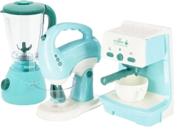 Stilīgs un funkcionāls AGD 3-in-1 komplekts mazajiem pavāriem piedāvā visu nepieciešamo mājas kafejnīcai vai virtuves eksperimentiem. Bērni izbaudīs reālistisku spēli, pateicoties ūdens ieliešanai no kafijas aparāta, miksera rotējošajām slotiņām un blendera griežamajam asmenim. Integrētās gaismas un skaņa pastiprina iespaidu un pietuvina spēli īstai gatavošanai.