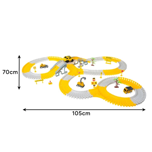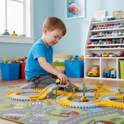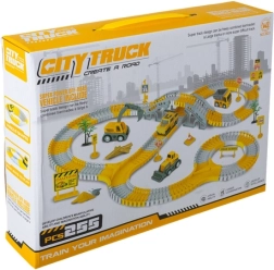 Uzbūvējiet savu būvniecības pilsētu un baudiet stundām ilgu radošu izklaidi! Šī elastīgā sacīkšu trase ar 255 detaļām piedāvā modulāru trasi, būvniecības transportlīdzekļus un bagātīgu piederumu komplektu. Pateicoties viegli savienojamiem segmentiem, tiltam un rampām, bērni var veidot jebkādus izkārtojumus un attīstīt sīko motoriku, loģisko domāšanu un kreativitāti. Komplektā ietilpst ar baterijām darbināma mašīnīte un trīs būvniecības tehnikas reālistiskai spēlei.