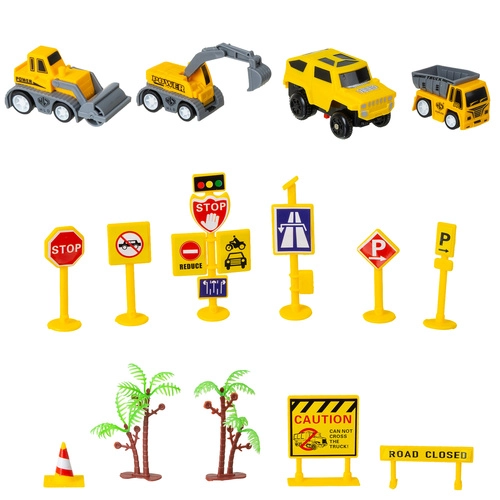 Ekskavators, ceļa rullis un pašizgāzējs kopā ar ceļa zīmēm, konusiem, barjerām un palmām veido autentisku būvlaukuma pasauli stundām ilgas iztēles pilnas spēles.