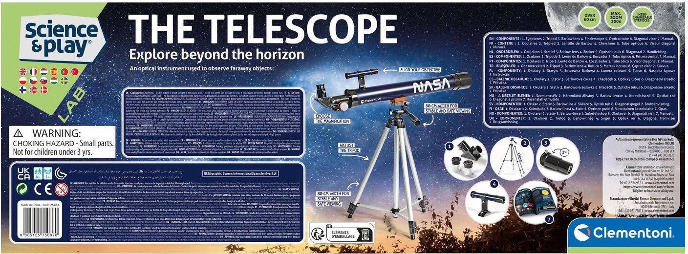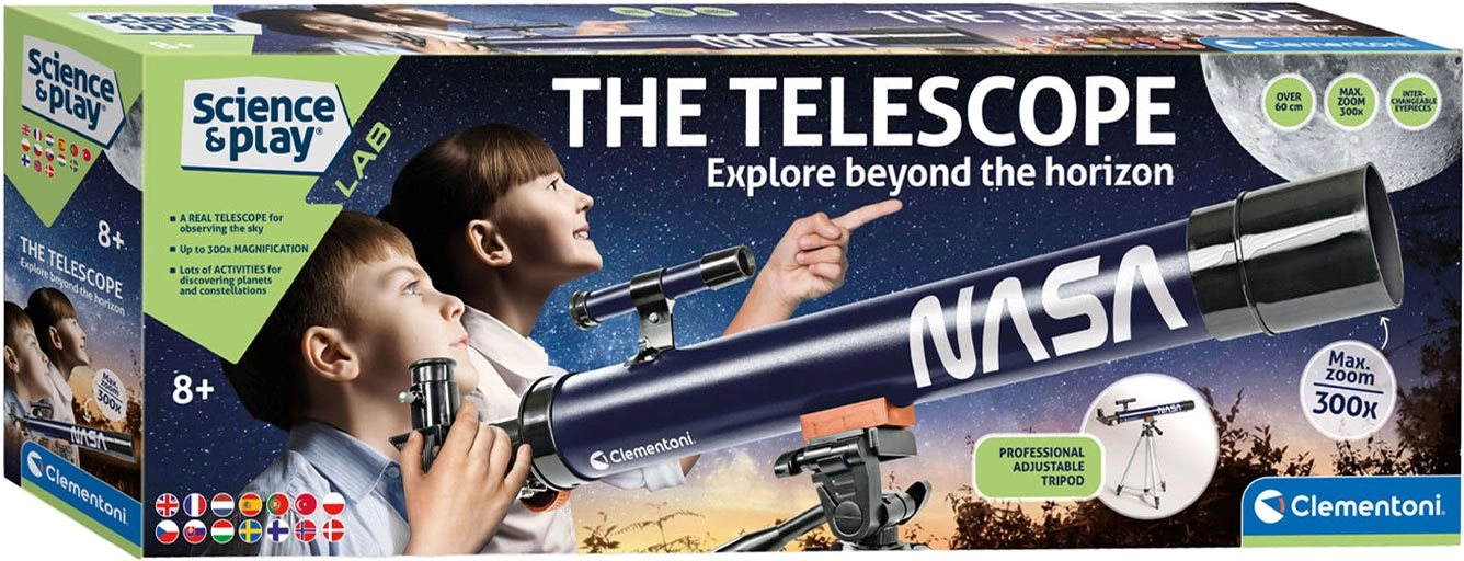 CLEMENTONI Science & Play bērnu teleskops ir perfekta ieeja astronomijas pasaulē. Tas nodrošina skaidru attēlu, pateicoties 50 mm diametra objektīvam un diviem maināmiem okulāriem (6 mm un 12 mm), ar kuriem bērni viegli izpētīs Mēnesi, zvaigznes un pamatobjektus nakts debesīs. NASA iedvesma un uzsvars uz izglītību padara to par ideālu izvēli mazajiem pētniekiem.