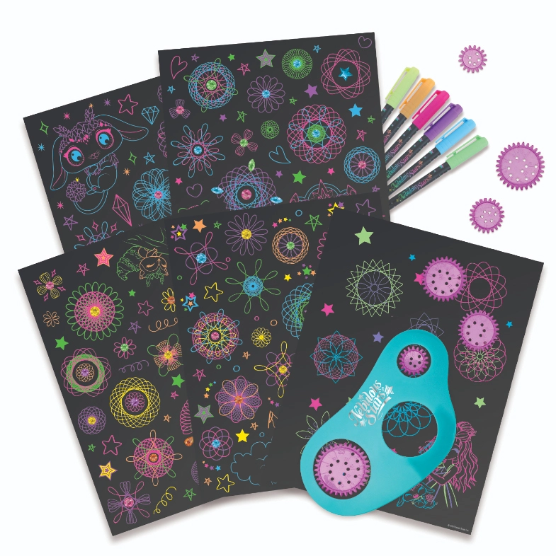 - Viegli un aizraujoši – ievietojiet ratiņu šablonā, zīmējiet ar neona pildspalvu un vērojiet, kā top aizraujošas spirāles.