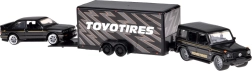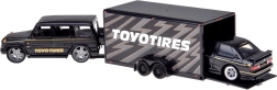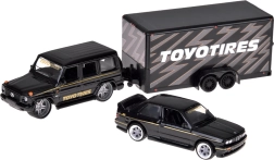 Atklājiet laikmetīgu duetu, kas iepriecinās gan kolekcionārus, gan auto entuziastus: robusto MERCEDES‑BENZ G (1988) un leģendāro BMW M3 E30 vienotā melnā krāsu salikumā. Metāla virsbūve ar precīzām līnijām, gumijas riteņi un tīras detaļu apdrukas piešķir modeļiem autentisku izskatu. Funkcionālā piekabe ar iebraukšanas rampu ļauj droši “pārvadāt” BMW aiz MERCEDES, kas palielina rotaļīgumu un pievilcību ekspozīcijā.