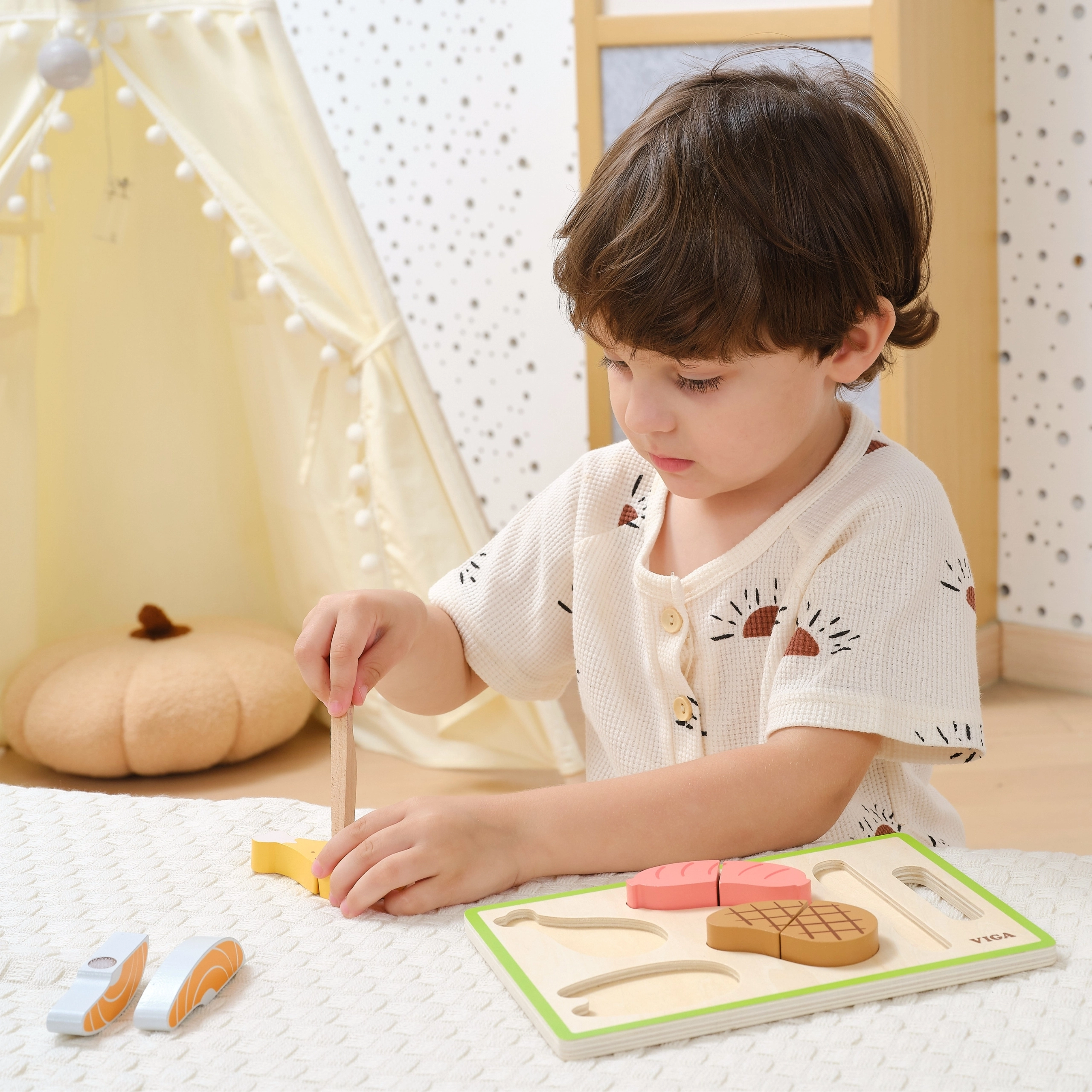 “Gaļas” gabaliņi ir sadalīti un savienoti ar līplenti – bērni tos var atkārtoti “griezt” ar koka nazi un salikt atpakaļ, kas ir gan jautri, gan izglītojoši.