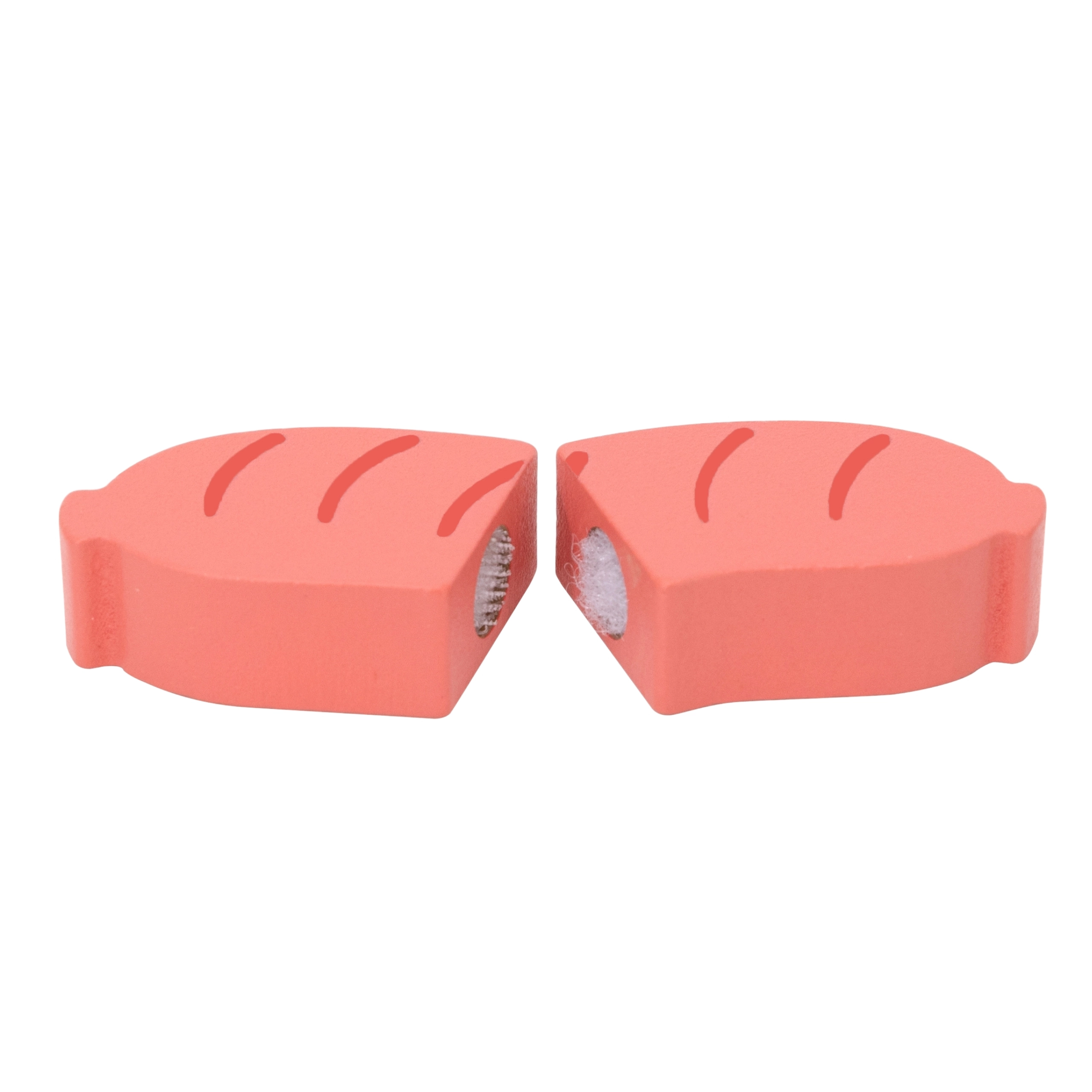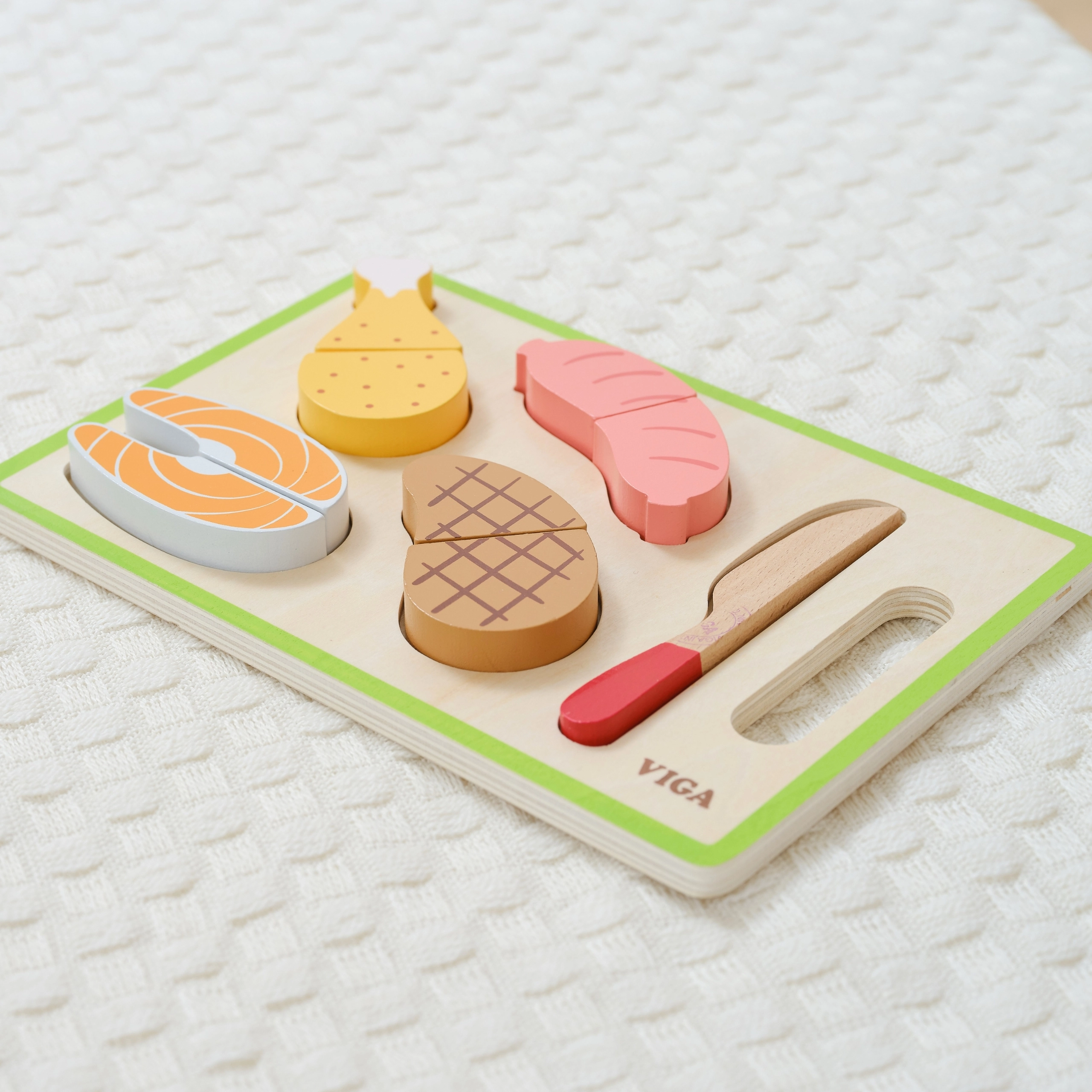 Šis koka griešanas komplekts bērniem sniedz reālistisku pavārmākslas pieredzi drošā veidā. Atsevišķie “gaļas” gabaliņi ir savienoti ar līplenti, līdz ar to tos var viegli atdalīt ar koka nazi un salikt no jauna. Spēle dabiski attīsta sīko motoriku, loģisko domāšanu un sadarbību kopīgās rotaļās ar vecākiem vai draugiem.