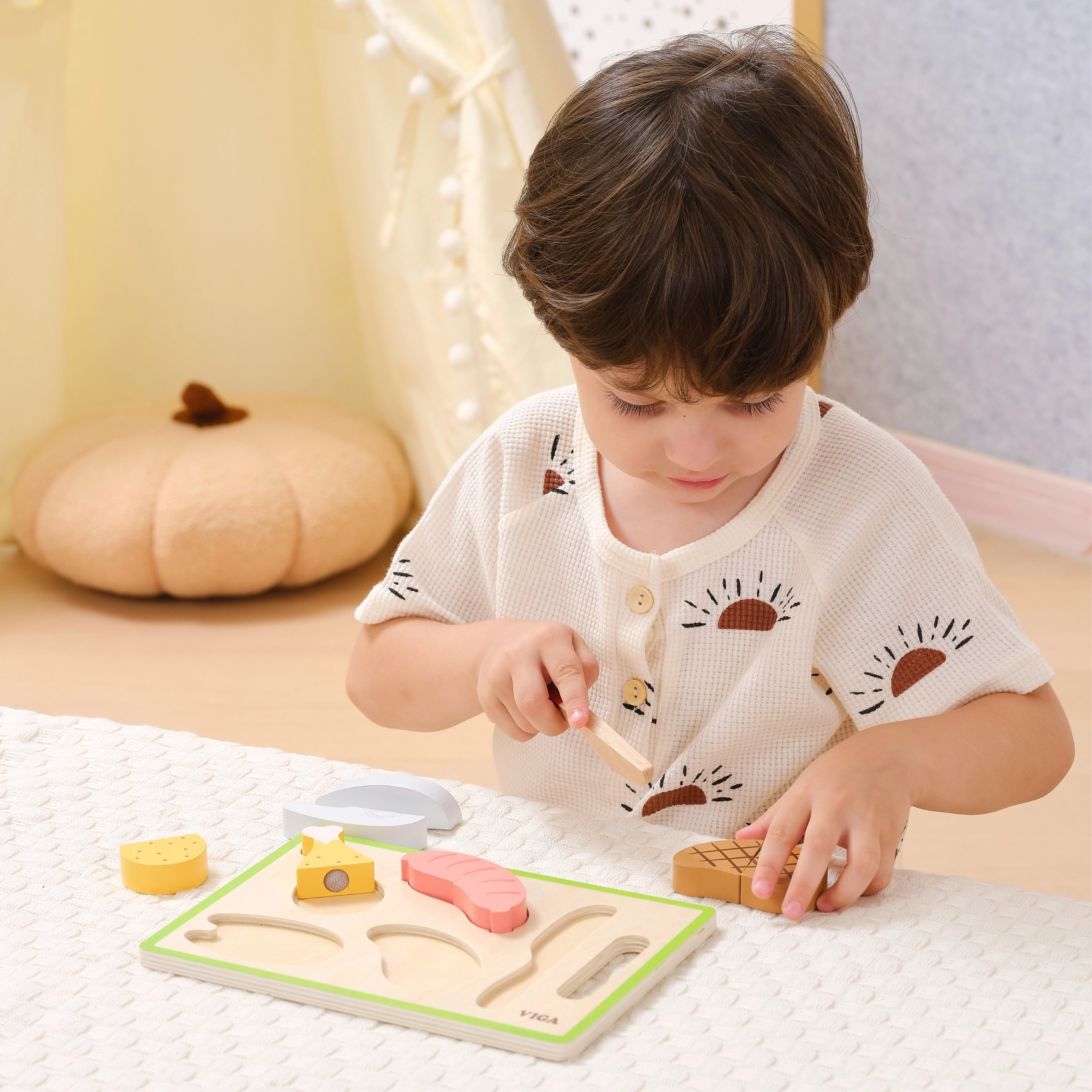 Komplektā ir izturīgs koka dēlītis ar satvērienu, drošs nazis un koši pārtikas gabaliņi ar skaistām detaļām. Pateicoties kvalitatīvam izpildījumam un gludām malām, komplekts ir lieliski piemērots ikdienas spēlēm un kā dāvana estētiskā iepakojumā.