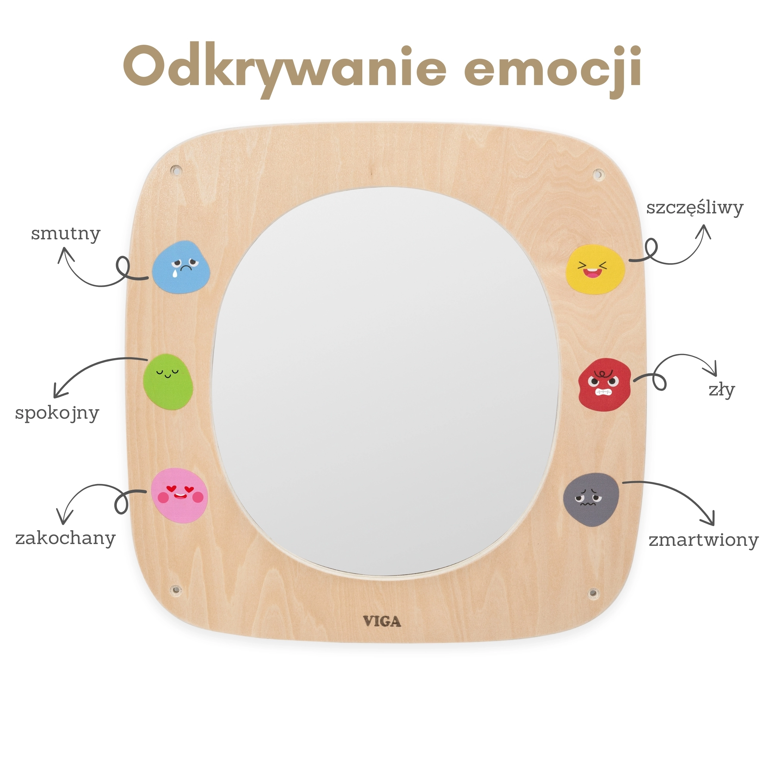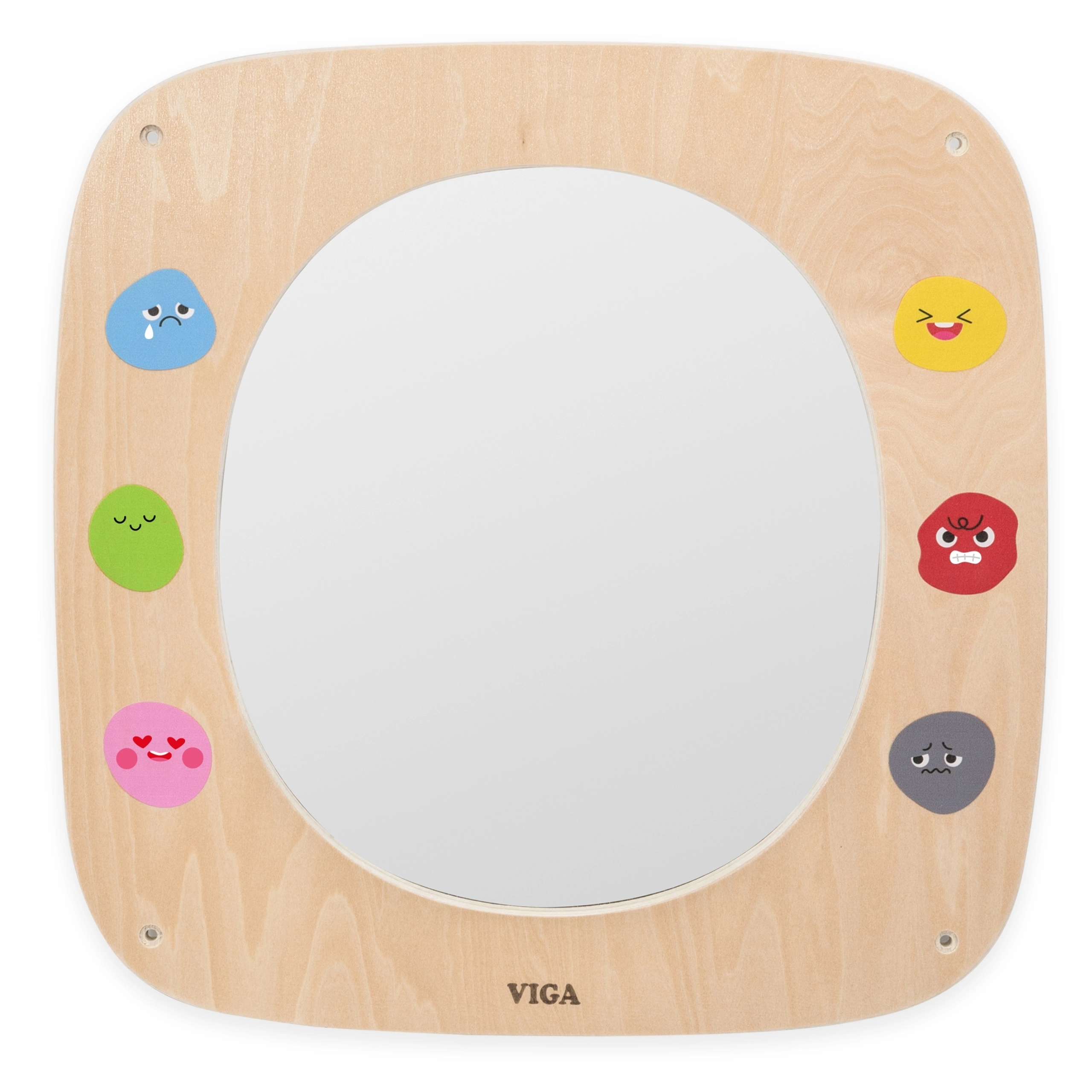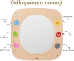 Koka spoguļa tāfele VIGA ir ideāli piemērota bērnu istabai, bērnudārziem un rotaļu stūrīšiem. Lielais drošais spogulis ar pārskatāmu rāmi palīdz bērniem iepazīt savas sejas izteiksmes, atdarināt mīmiku un mācīties atšķirt emocijas. Krāsainās emocijzīmes ap rāmi iedvesmo sarunām par sajūtām un dabiski attīsta emocionālo intelektu.