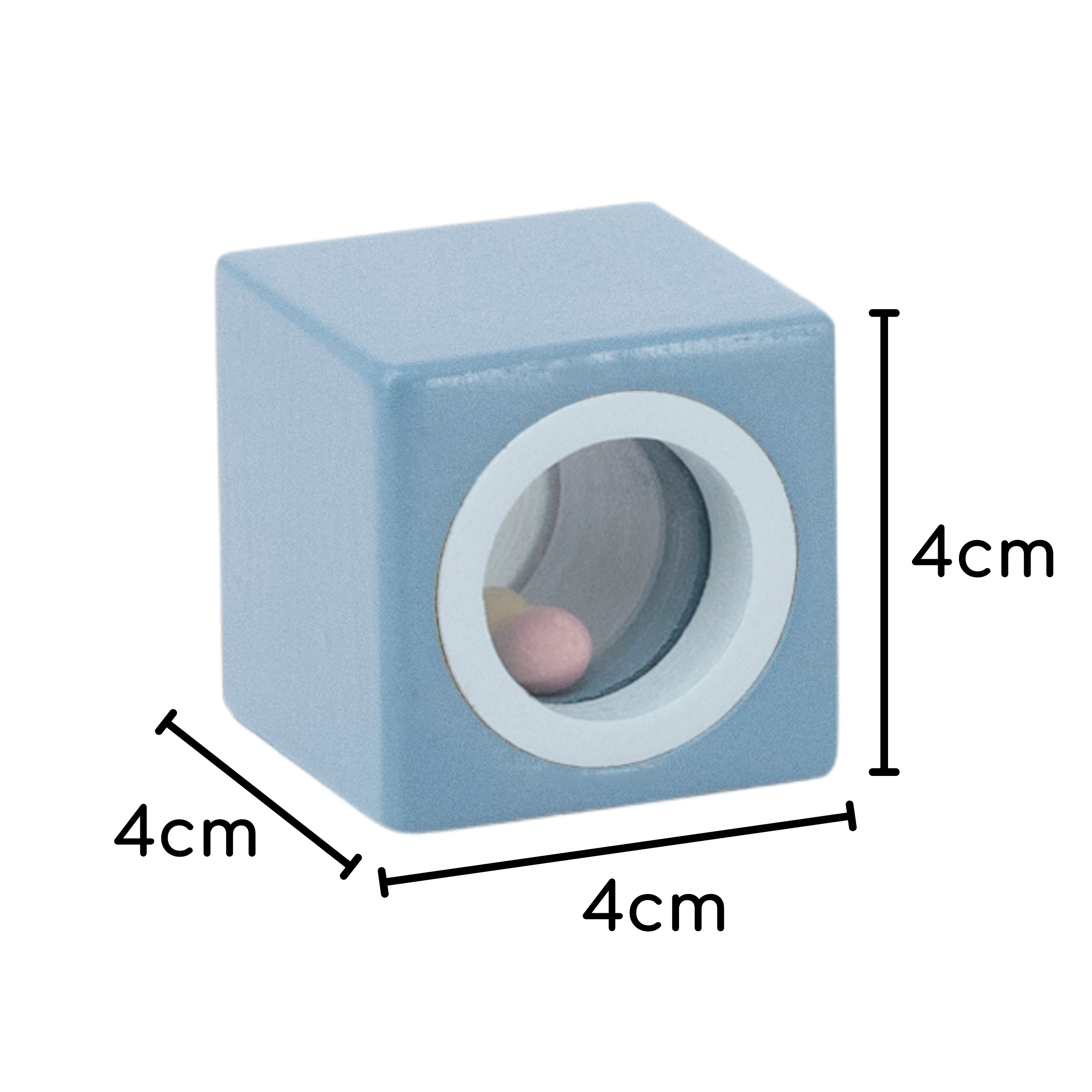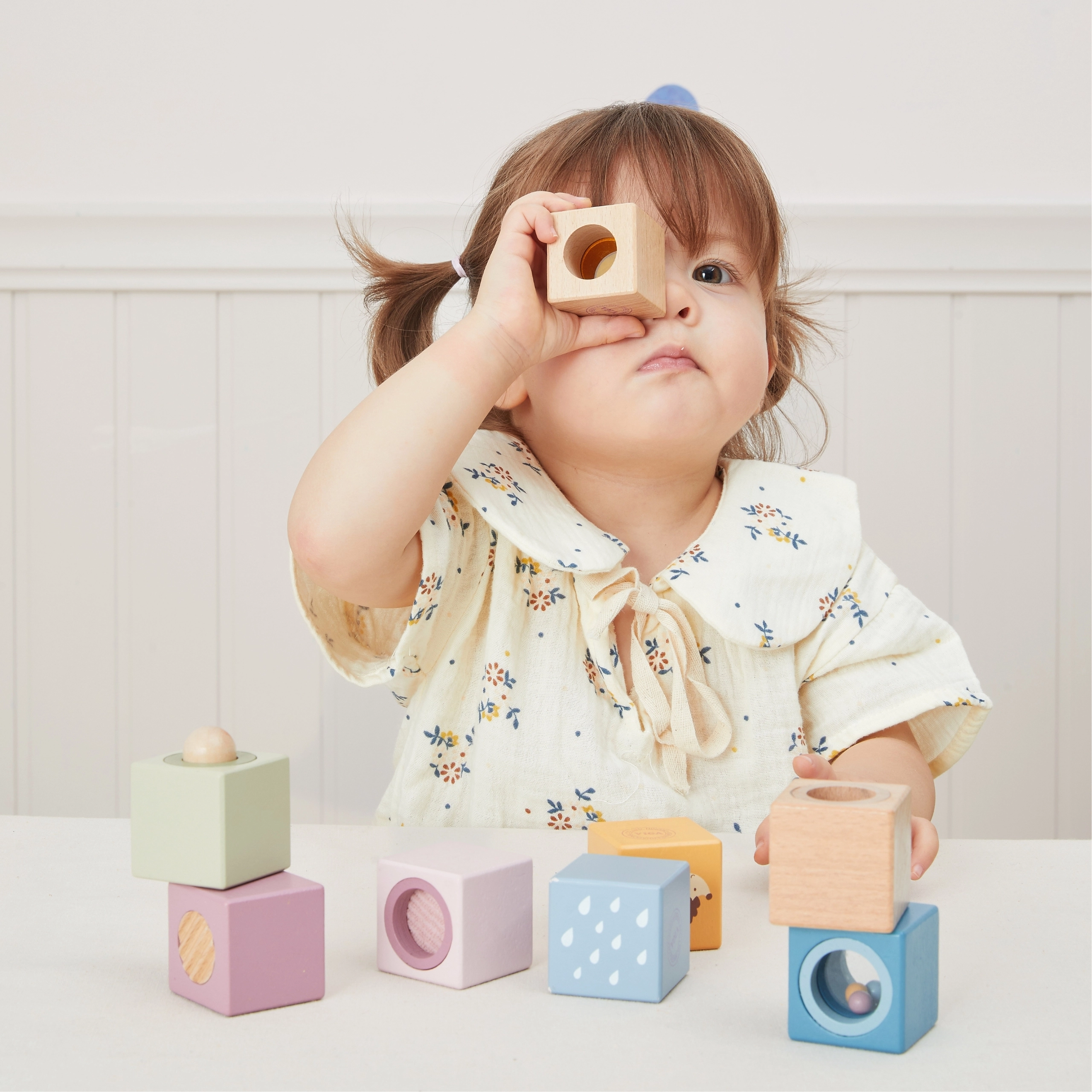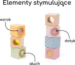 Katrā klucītī ir unikāls elements multisensorai stimulācijai – no spogulīša un grabulīša līdz taustes struktūrām. Pateicoties ērtajiem izmēriem, tos ir viegli satvert; tie attīsta acu–roku koordināciju, sīko motoriku un veicina radošu brīvo rotaļu.