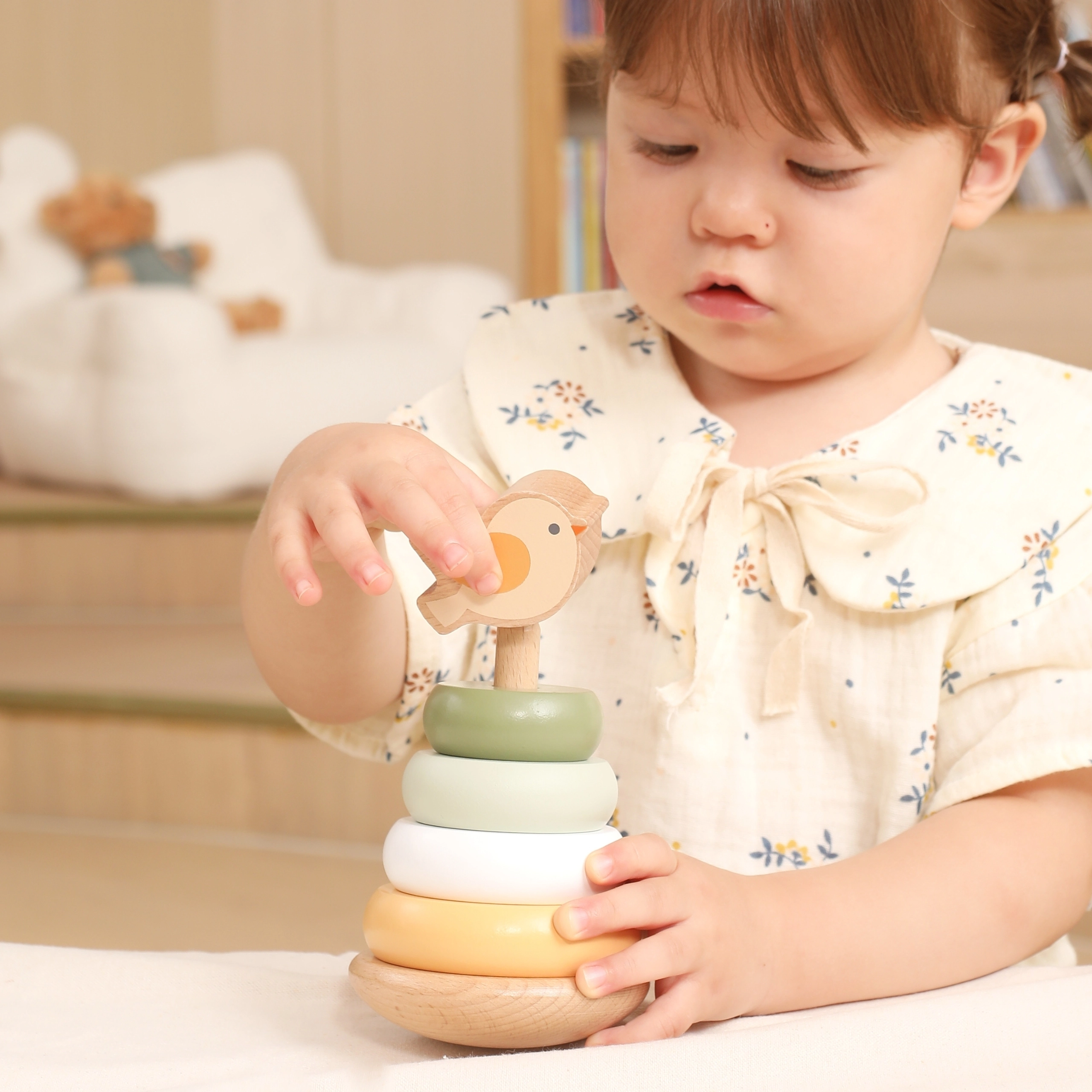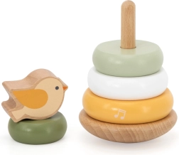 Koka kārtojamais tornis ar mīlīgo putniņu virsotnē iepriecinās katru mazuli. Krāsainie riņķi ar gludām malām ir viegli satverami un kārtojami dažādā secībā, kas veicina krāsu un izmēru atšķiršanu un problēmu risināšanu. Stabilā pamatne un patīkami noapaļotas formas nodrošina drošu lietošanu mazām rokām.