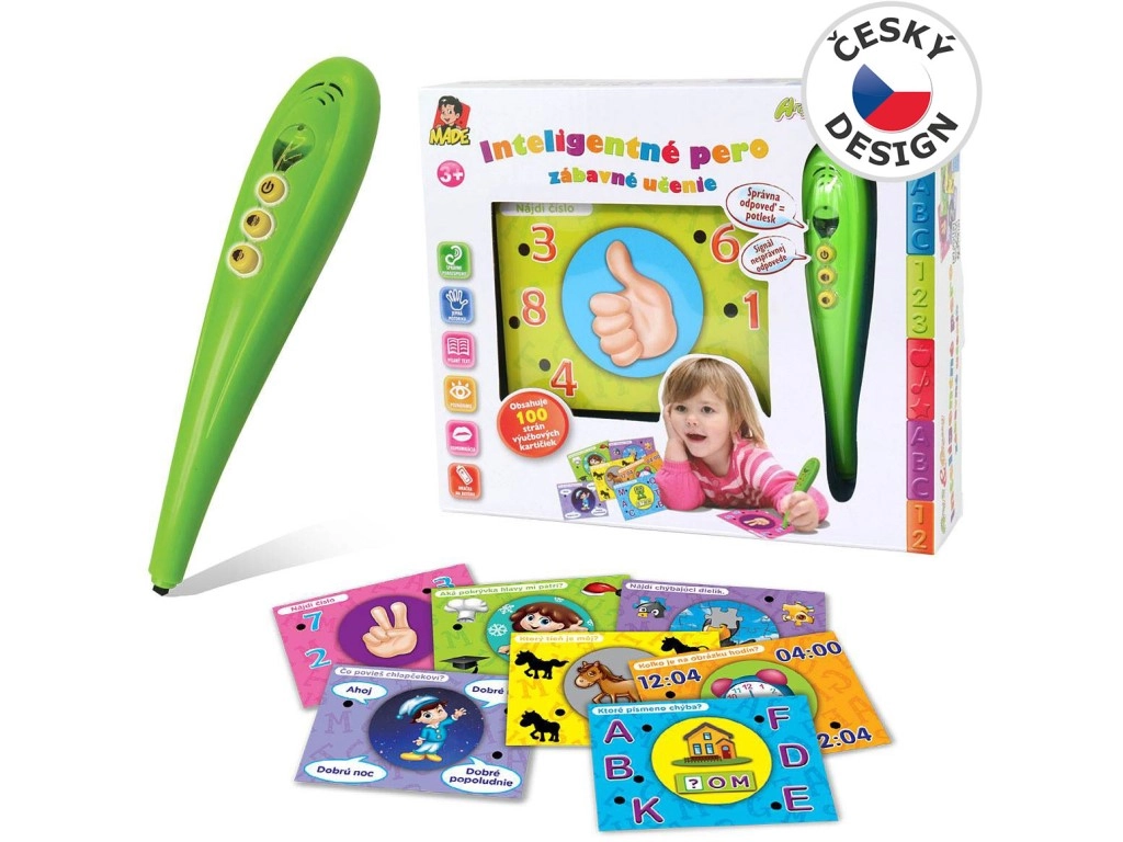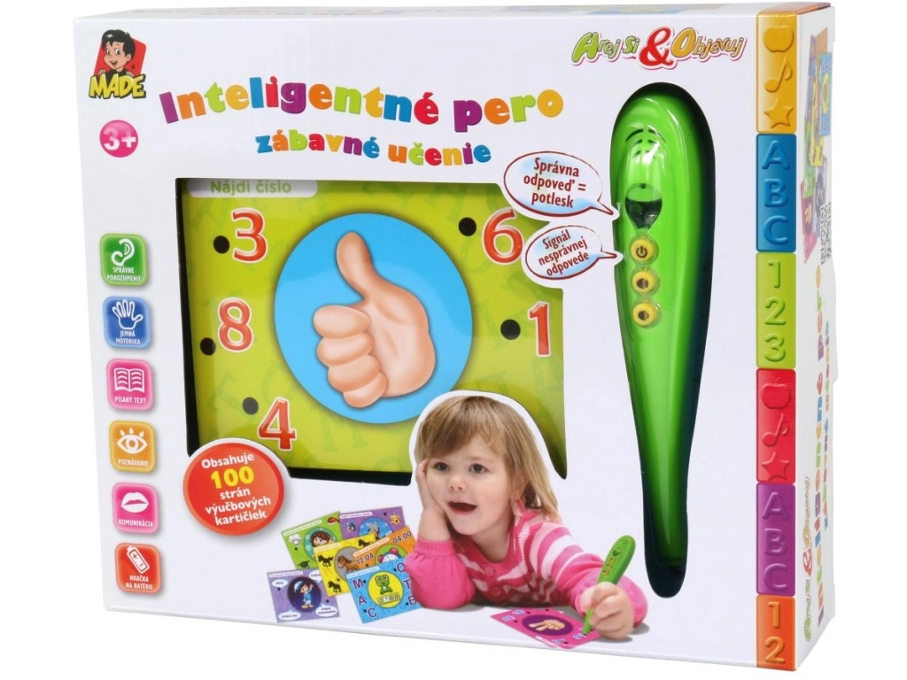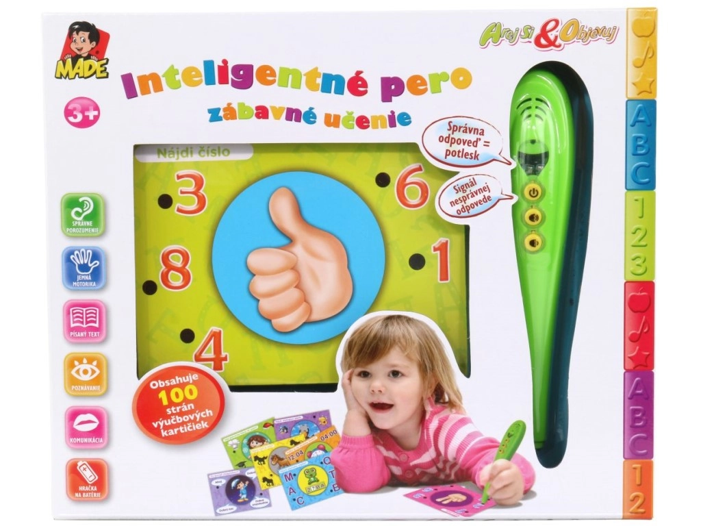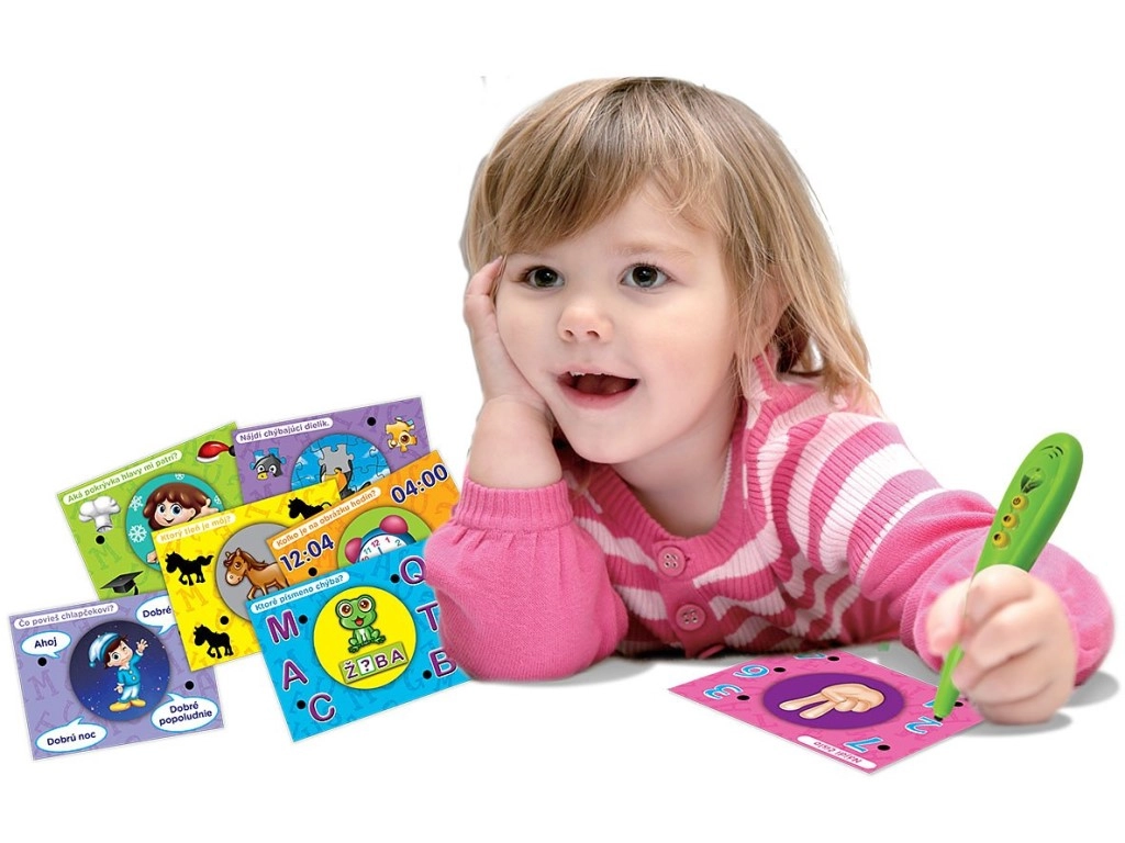 Atklājiet aizraujošu mācīšanos ar komplektu, kas apvieno gudru interaktīvu pildspalvu un krāsainas uzdevumu kartītes slovāku valodā. Bērni atbild, pieliekot pildspalvu pie izvēlētās atbildes – zaļa gaismiņa norāda pareizi, sarkana – nepareizi. Neiztrūkst skaļuma regulēšana, kompakti izmēri un vienkārša lietošana gan pirmsskolniekiem, gan sākumskolas bērniem.