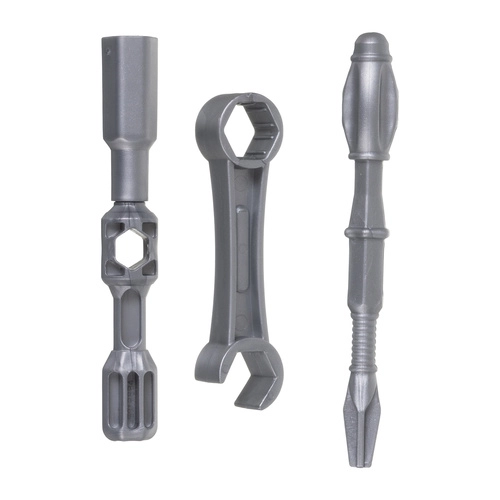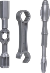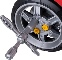 Komplektā ir droši plastmasas instrumenti – skrūvgriezis, atslēgas un uzgaļi. Ideāli tvēriena, koordinācijas un patstāvības trenēšanai montāžas un demontāžas laikā.