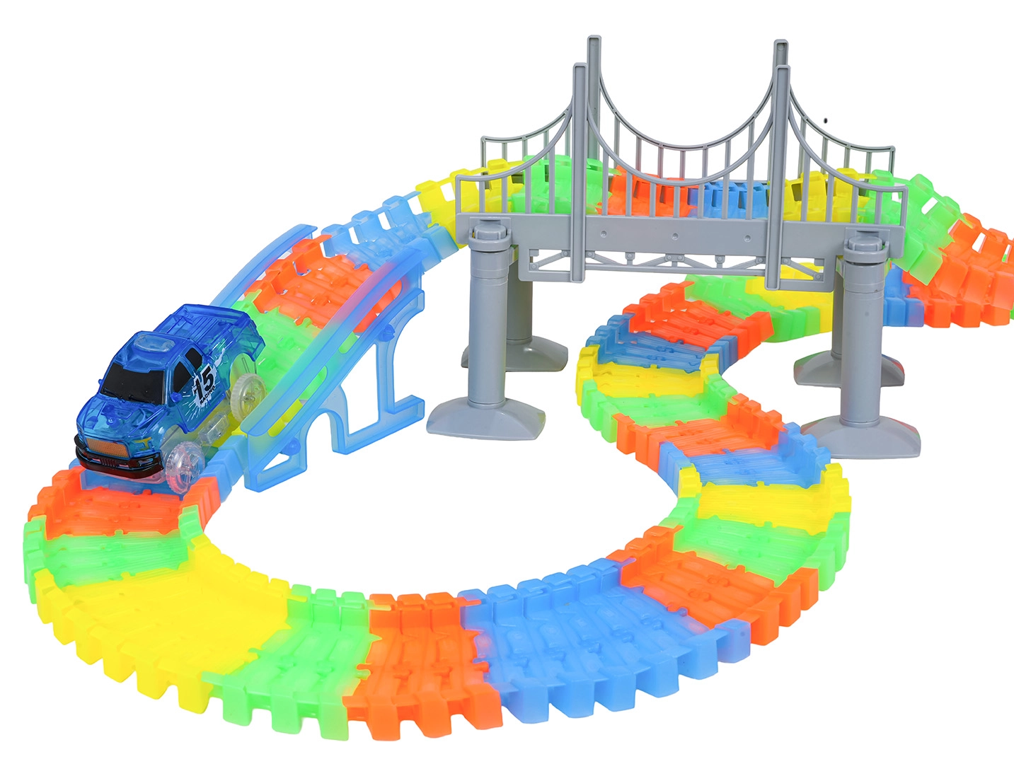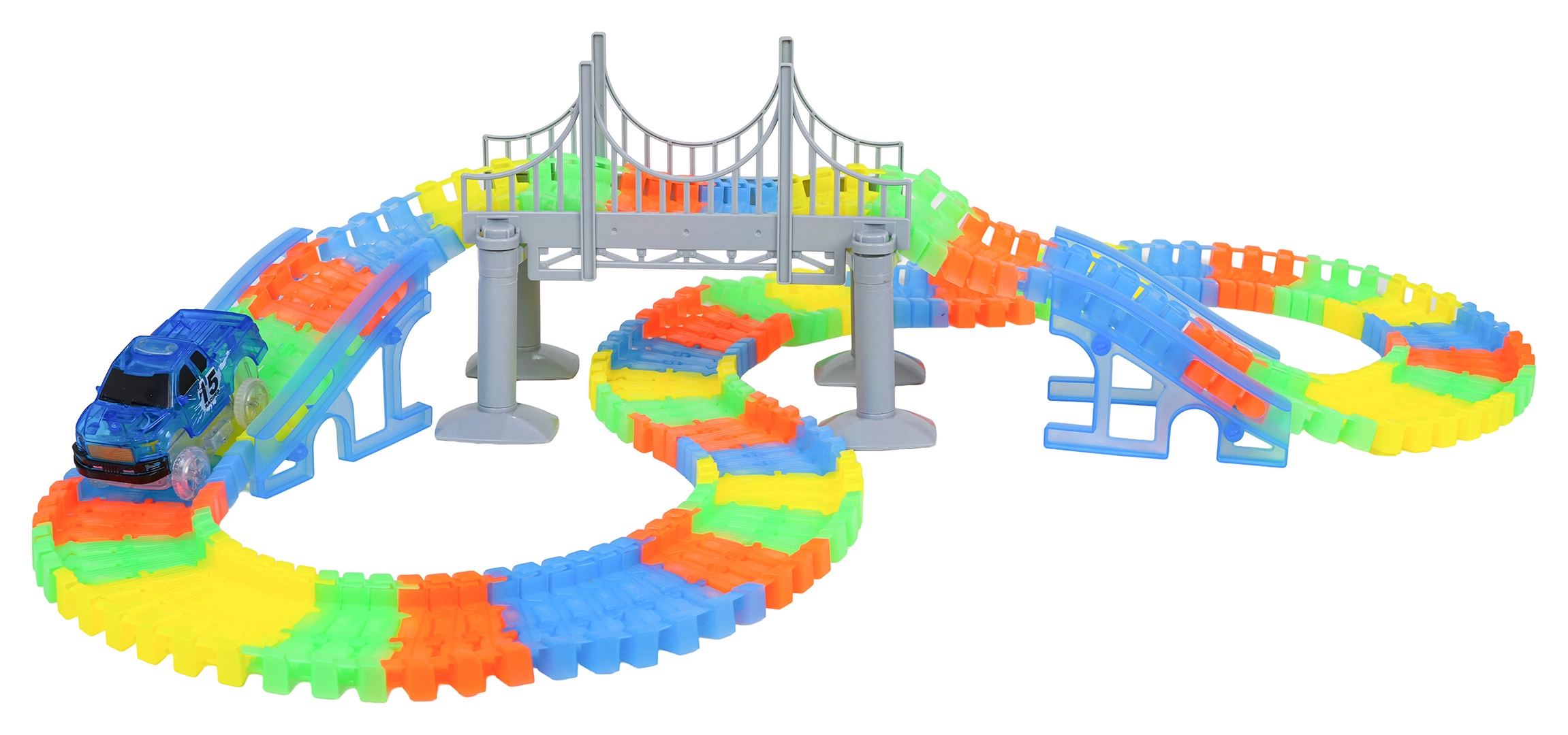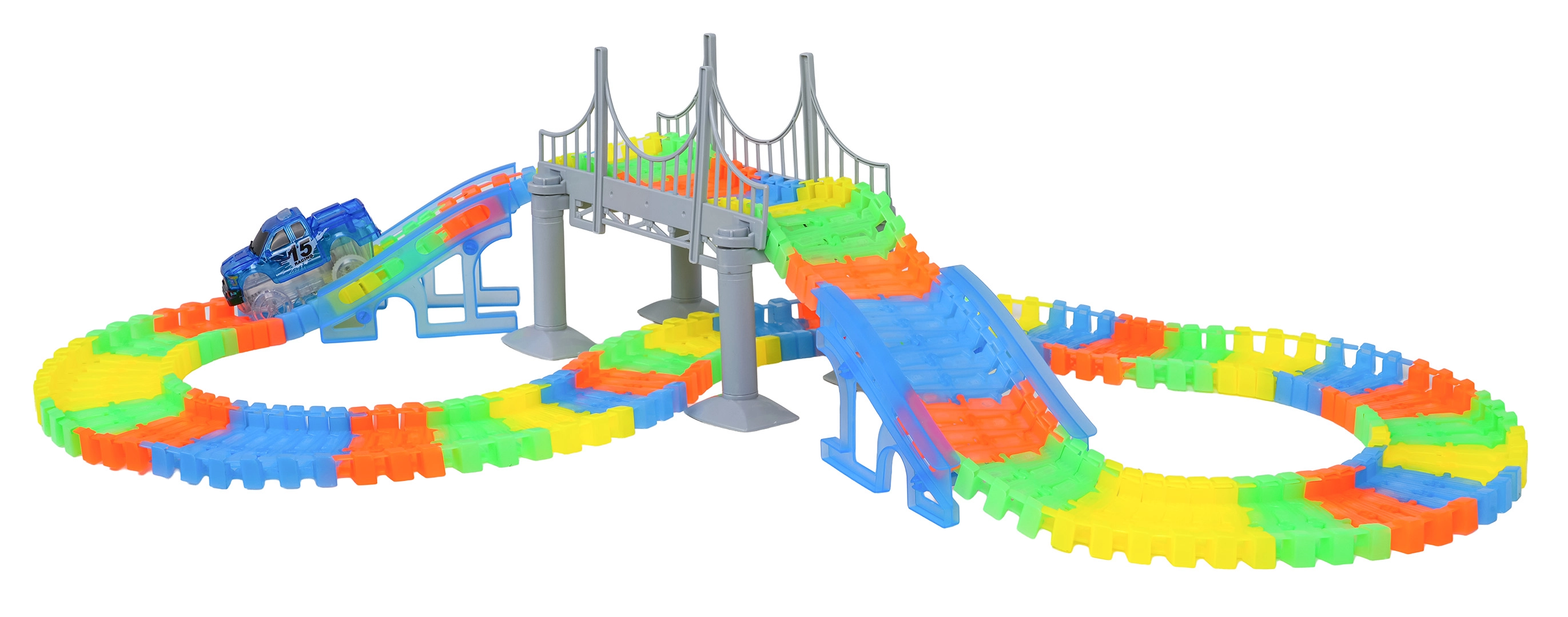 Šī radošā sacīkšu trase piedāvā bērniem no 3 gadiem stundām ilgu aizraujošu spēli. Detaļas viegli savienojas, trase ir liecama un grozāma, tāpēc var veidot tiltus, rampas un drosmīgus līkumus. Sliedu fluorescējošais pārklājums pēc gaismas izslēgšanas izgaismo telpu.