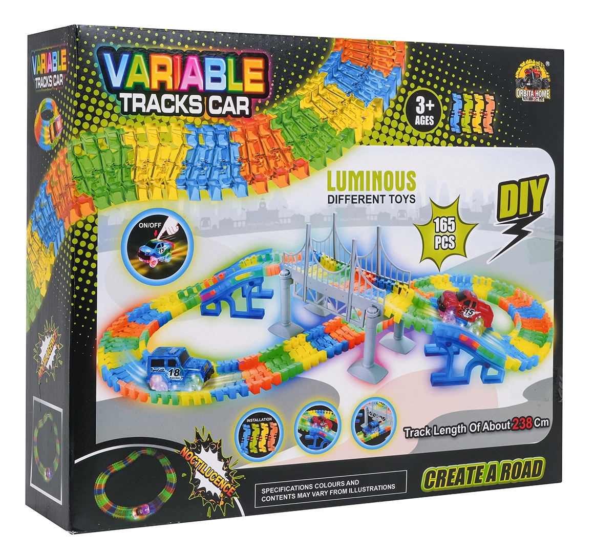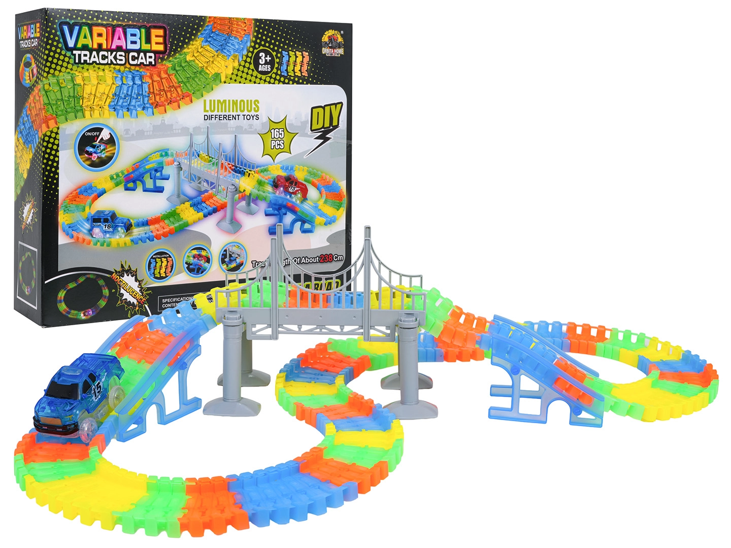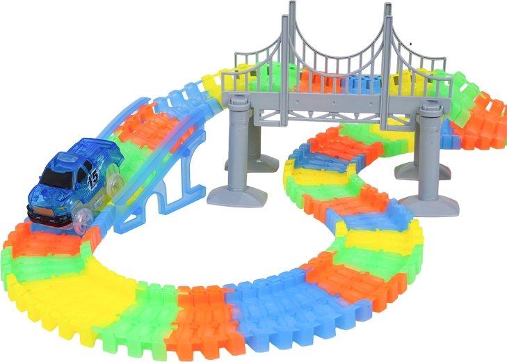 Šī radošā sacīkšu trase piedāvā bērniem no 3 gadiem stundām ilgu aizraujošu spēli. Detaļas viegli savienojas, trase ir liecama un grozāma, tāpēc var veidot tiltus, rampas un drosmīgus līkumus. Sliedu fluorescējošais pārklājums pēc gaismas izslēgšanas izgaismo telpu.