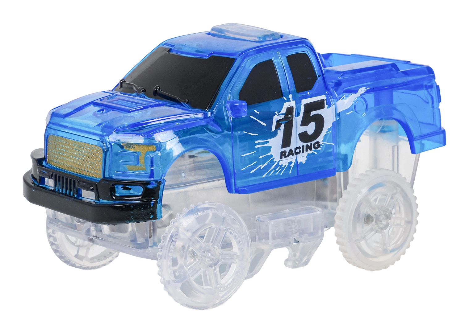 Caurspīdīgā sacīkšu mašīnīte ar LED diodēm atdzīvina trasi. Pietiek nospiest pogu uz jumta. Barošana ar 2× AA baterijām (nav iekļautas).