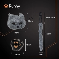 Izpaudiet sevi pilnībā ar stilīgo RUHHY 4‑in‑1 komplektu. Maska ar gumiju, garā regulējamā aste ar elastīgu stiepli un mīlīgās ķepas/cimdi veido universālu tērpu cosplay, konventiem, ballītēm, video un tematiskiem foto. Mīksta un patīkama mākslīgās kažokādas apdare ir ērta valkāšanā un izskatās reālistiski.