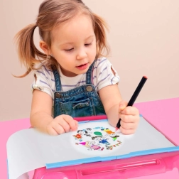 Komplektā ietilpst 6 motīvu lapas (kopā 72 attēli), komplekts ar 12 krītiņiem un 12 flomāsteriem. Galdiņam ir integrēti uzglabāšanas nodalījumi un caurspīdīgs drošības pārsegs. Ideāli piemērots bērniem no 3 gadu vecuma, attīsta sīko motoriku, koncentrēšanos un iztēli.