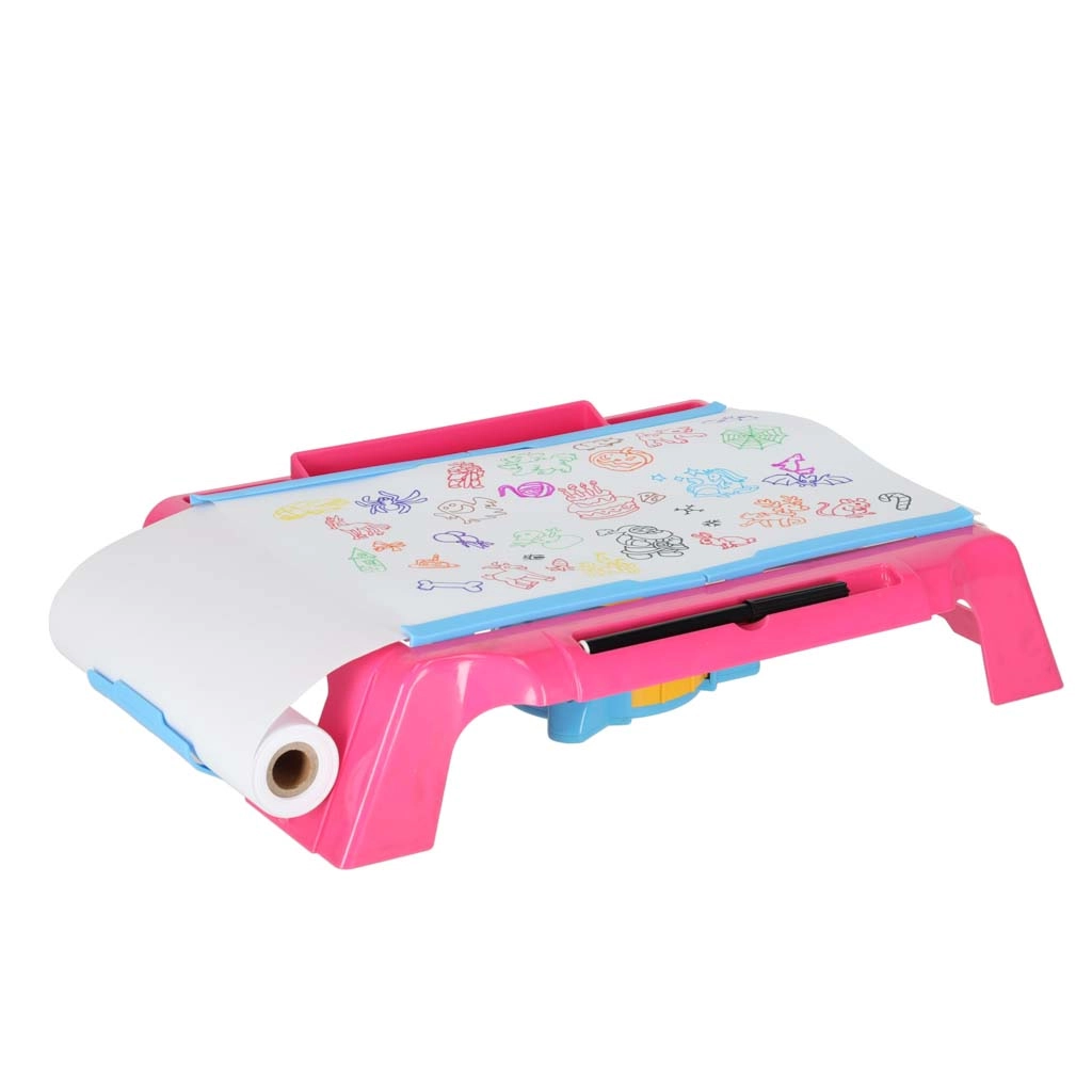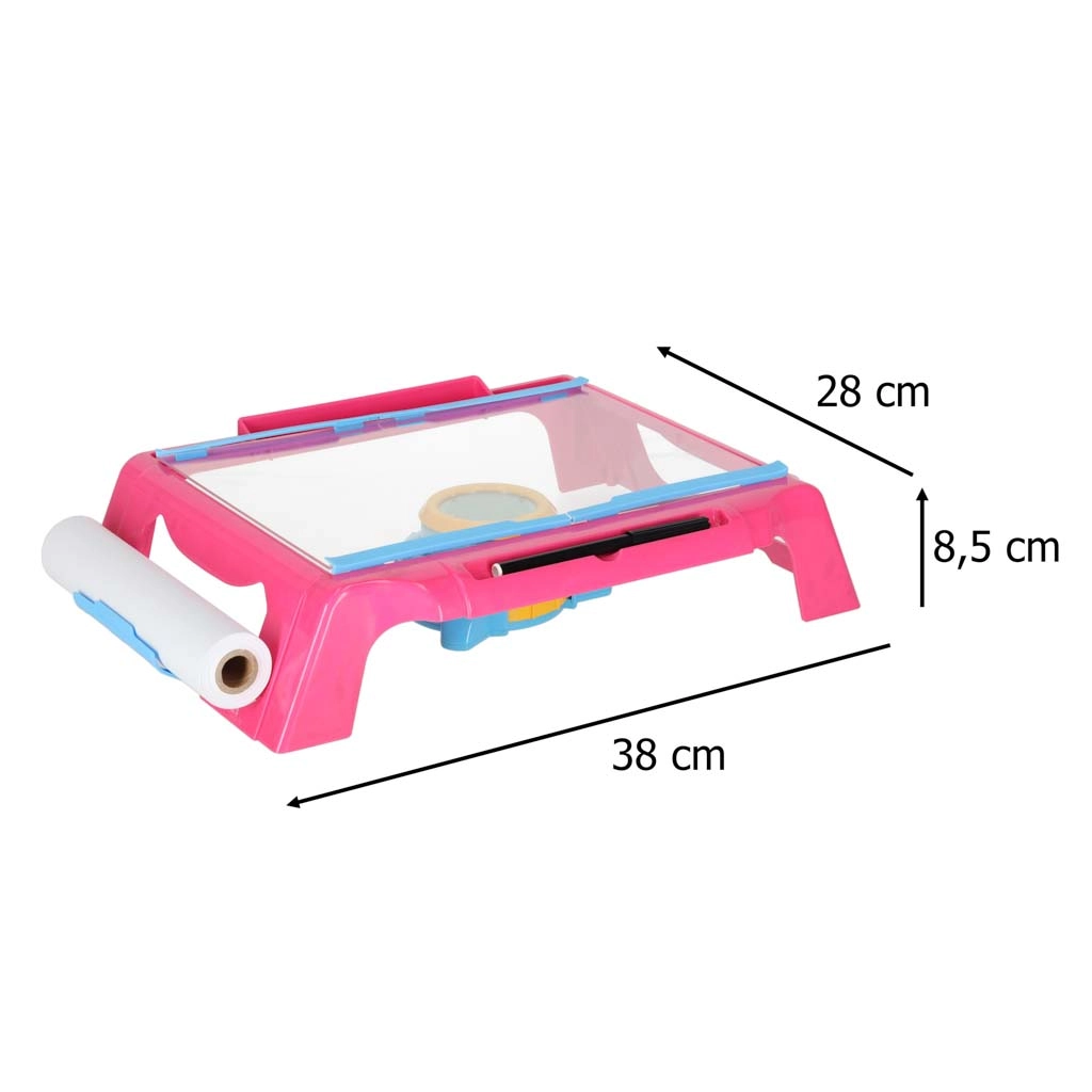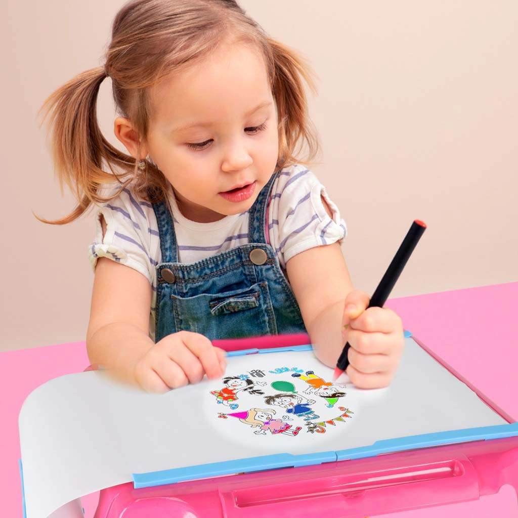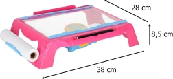 Šis kompaktā izmēra zīmēšanas galdiņš ar projektoru projicē attēlus tieši uz papīra, lai bērni varētu viegli pārvelkt kontūras un soli pa solim apgūt zīmēšanu. Pārskatāma darba virsma, padevējs ar papīra rulli un 4 skavas notur papīru stingri savā vietā. Regulējamā projektora lēca nodrošina asu attēlu skaidrām līnijām.