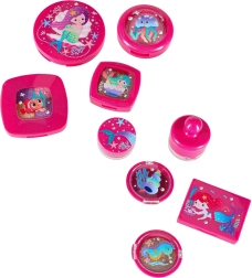 Atbalstiet bērnu fantāziju ar pilno 22 gabalu grima un nagu kopšanas komplektu elegantā koferītī. Ideāli spēlēm frizētavā vai skaistumkopšanas salonā – droši, tīri un ar daudz piederumiem. Iekšpusē atradīsiet, piemēram, putu ēnas, vaigu sārtumu, pūderi, otiņas un manikīra piederumus.