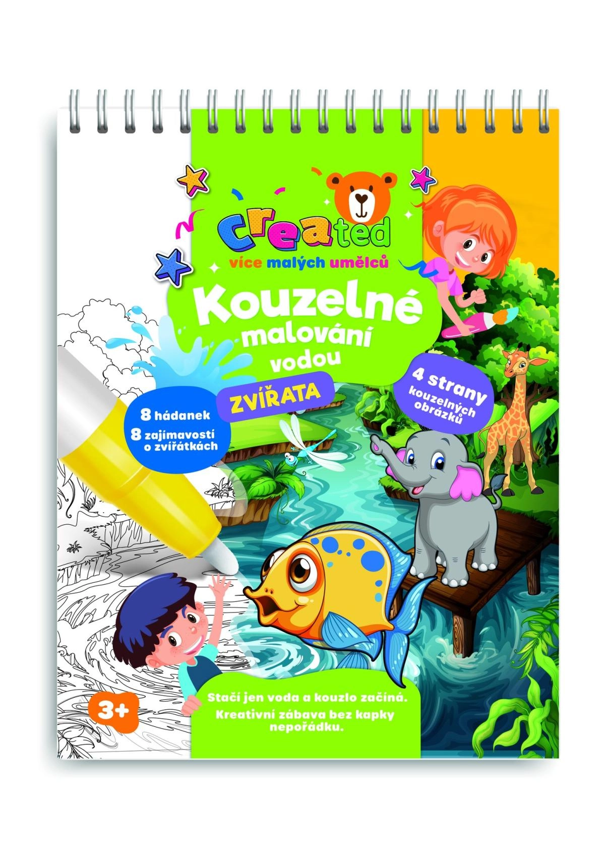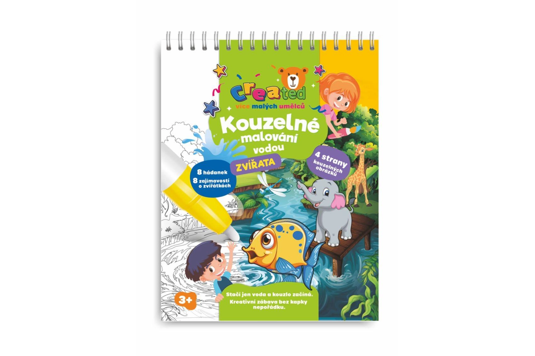 Atklājiet mierīgu krāsošanu bez nekārtības! Radošais bloks ar dzīvnieciņu motīvu piedāvā 4 burvīgus attēlus, ūdens pildspalvu un jautras mīklas. Pietiek pievienot ūdeni, un krāsas atdzīvosies – pēc nožūšanas tās izzudīs, un bērni var krāsot atkal.