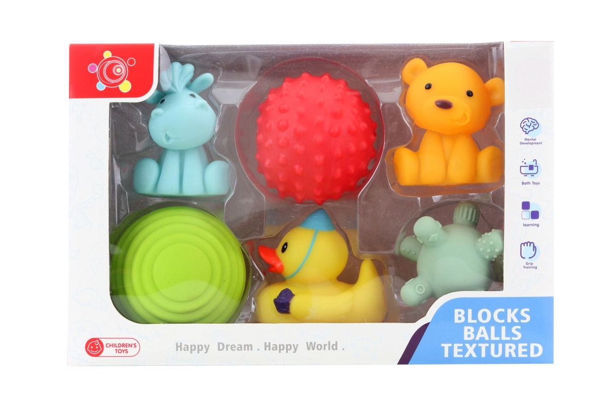 Atklājiet jautru gumijas vannas rotaļlietu komplektu pašiem mazākajiem, ideāli piemērotu vannai un baseinam. Iepakojumā ir 3 formas rotaļlietas un 3 dzīvnieciņu rotaļlietas, kas veicina maņu attīstību un sīko motoriku. Drošas bērniem no 6 mēnešu vecuma, viegli satveramas un peld uz ūdens.