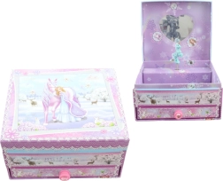Burvīga mūzikas rotaslietu lādīte ar vienradža motīvu iepriecinās ikvienu mazo dārgumu cienītāju. Pagriežot atslēdziņu un atverot vāku, figūriņa sāk griezties un skan patīkama melodija. Iekšpusē ir spogulītis, ērts rotu piemērīšanai, bet apakšā izvelkama atvilktnīte gredzeniem, rokassprādzēm un citām sīklietām. Kompaktie izmēri apm. 16 × 14 × 9 cm un smalkie pasakaini motīvi padara šo lādīti par skaistu bērnistabas akcentu un lielisku dāvanu.