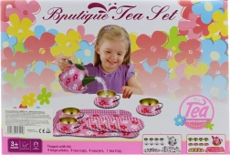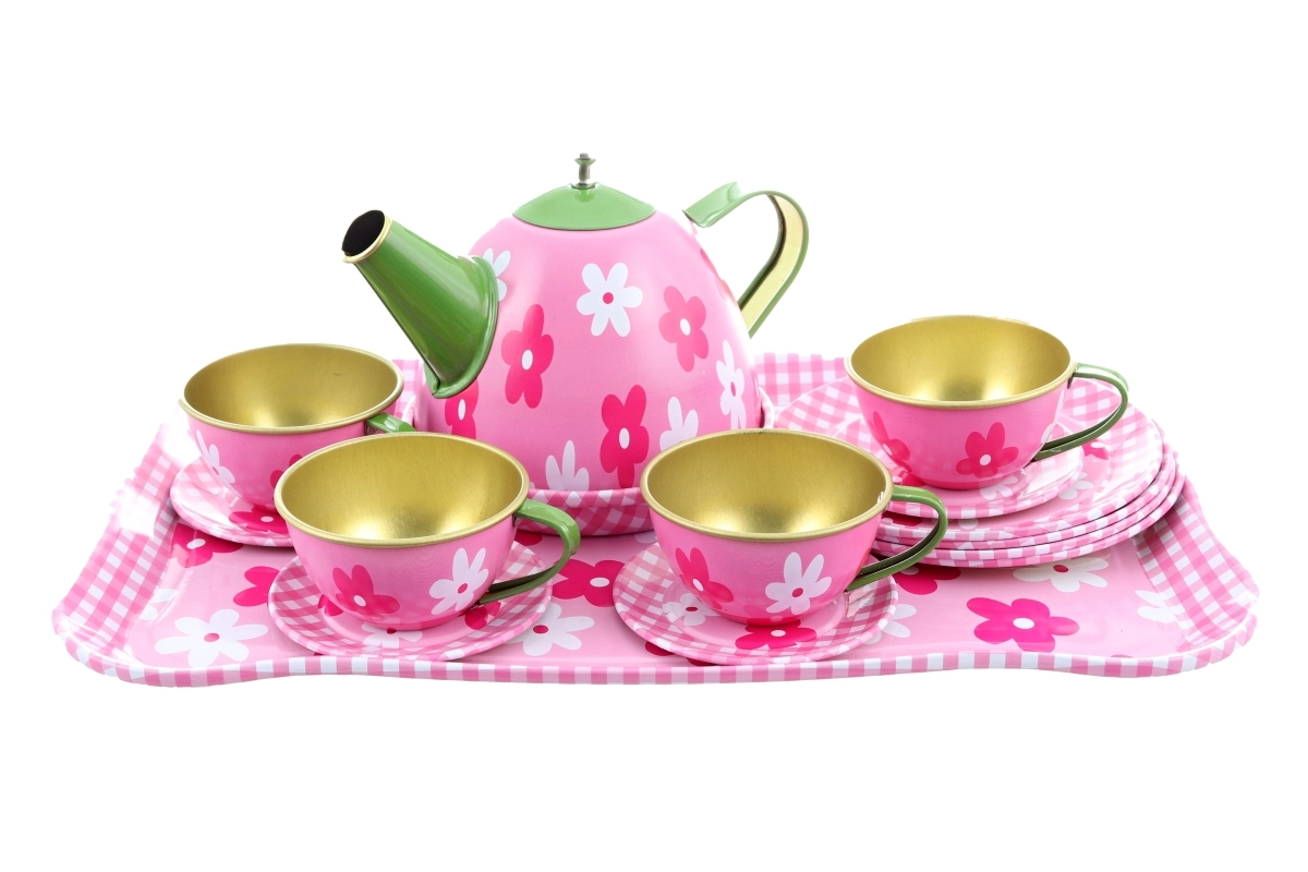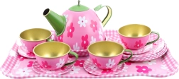 Stilīgs metāla tējas komplekts ar maigu ziedu motīvu iepriecinās ikvienu mazo saimnieci. Tas ietver visu nepieciešamo ideālai tējas ballītei – no kanniņas līdz šķīvīšiem un paplātēm. Komplektam ir viegla, izturīga un bērniem droša konstrukcija no 3 gadu vecuma. Komplekts pilnā sastāvā, ziedu dizains un izturīgs metāla izpildījums nodrošinās stundām ilgu izklaidi un attīstīs bērnu iztēli.