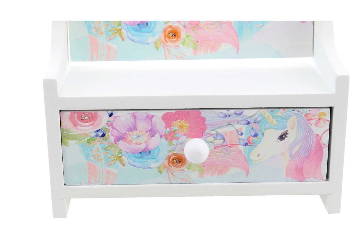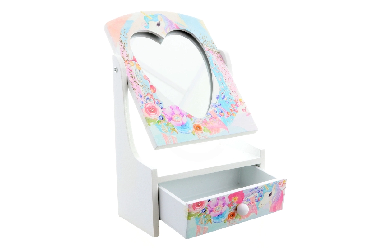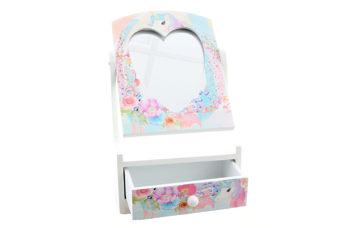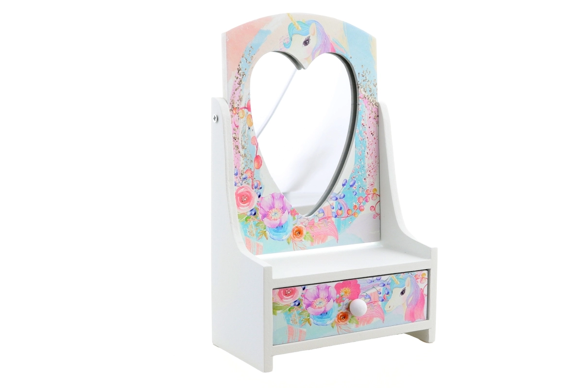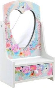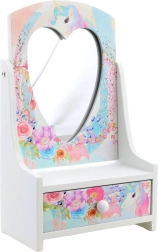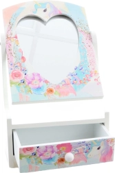 Jauka koka rotu lādīte ar noliecamu sirds formas spogulīti palīdz bērniem glabāt savus dārgumus pārskatāmi vienuviet. Maigie pasteļtoņu ziedu un vienradža motīvi padara to par skaistu bērnistabas dekoru un praktisku palīgu ikdienas ķemmēšanai un rotaļām.