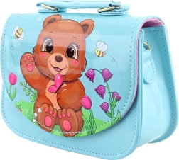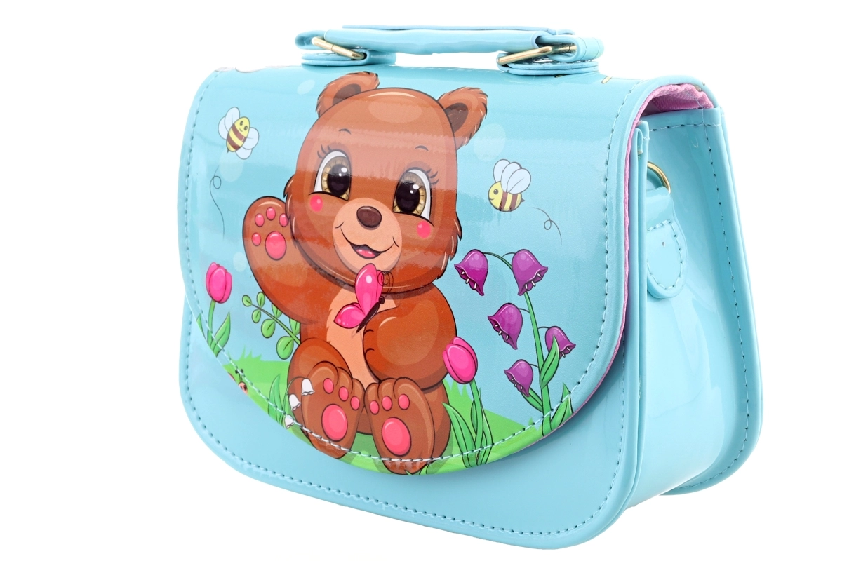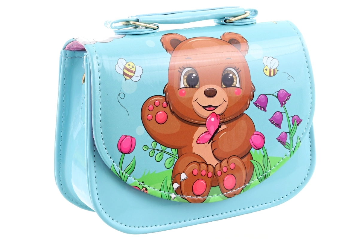 Jauka bērnu somiņa gaiši zilā krāsā ar lācīša motīvu iepriecinās mazos modes cienītājus. Tai ir spīdīga, viegli tīrāma virsma, praktiska spiedpogas aizdare un viena galvenā kabata sīkumiem. Kompaktie izmēri 18 × 14 × 7 cm ir ideāli salvetēm, mazām rotaļlietām vai aksesuāriem. Izstrādājums nav rotaļlieta.