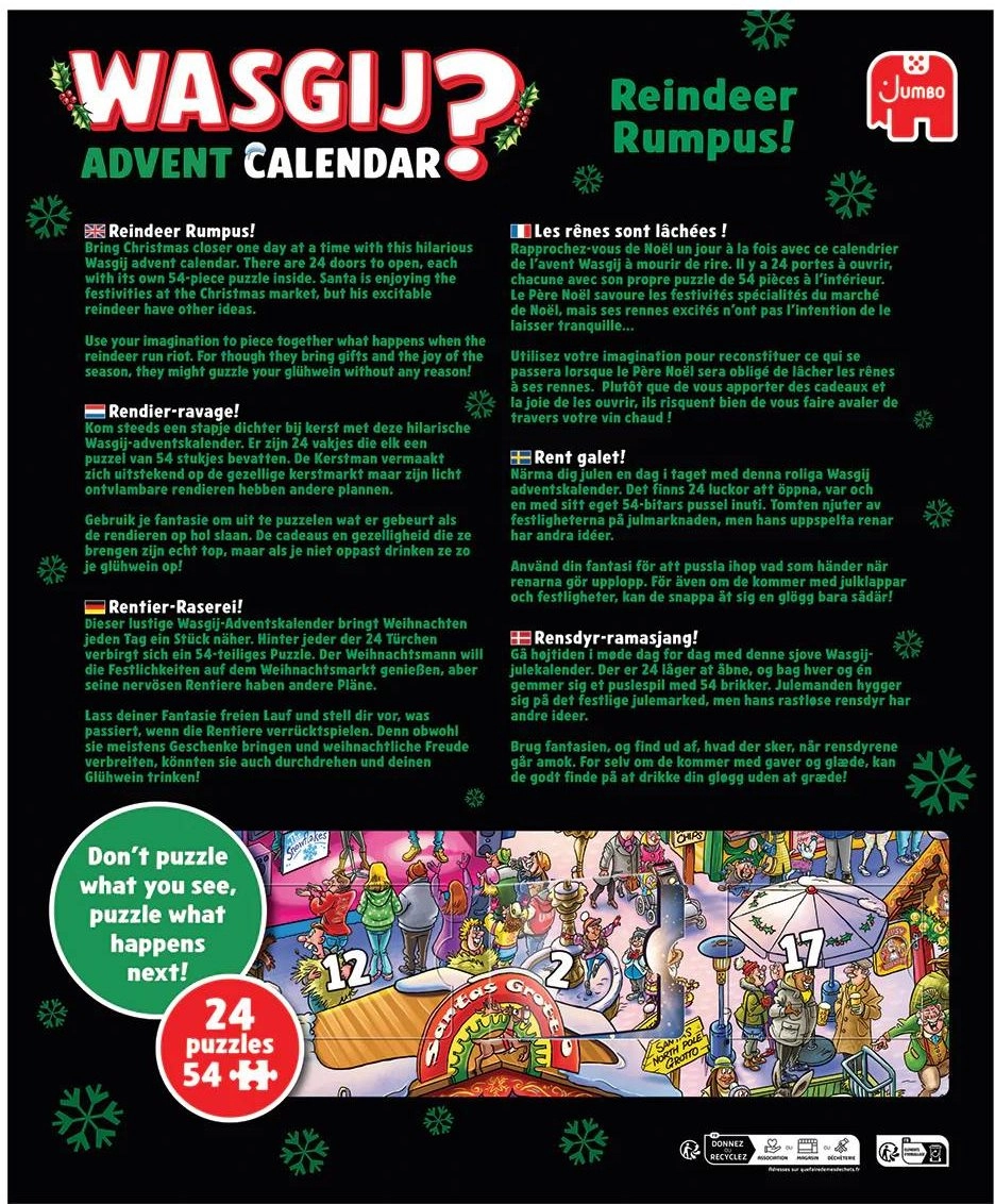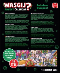 Padariet gaidīšanu līdz Ziemassvētku vakaram vēl jautrāku ar WASGIJ adventa kalendāru: Trakie ziemeļbrieži! Šis kalendārs piedāvā unikālu koncepciju, kur gala attēls nav tāds pats kā uz kastes. Jūs meklējat pavedienus, liekat lietā iztēli un saliekat ainu no cita skatpunkta. Ideāla dāvana pužļu cienītājiem un pieredzējušiem liktājiem, kuri vēlas ko jaunu.