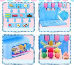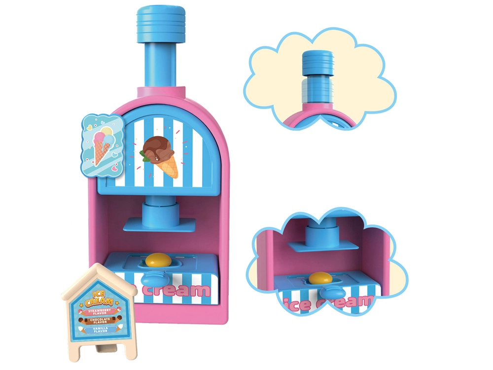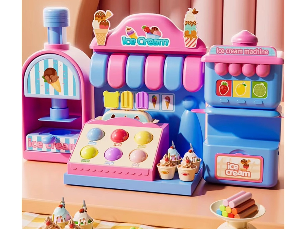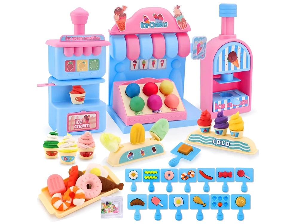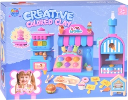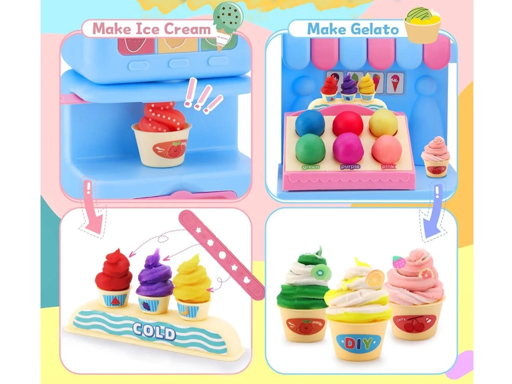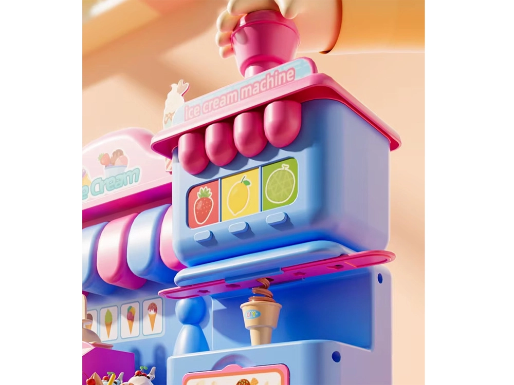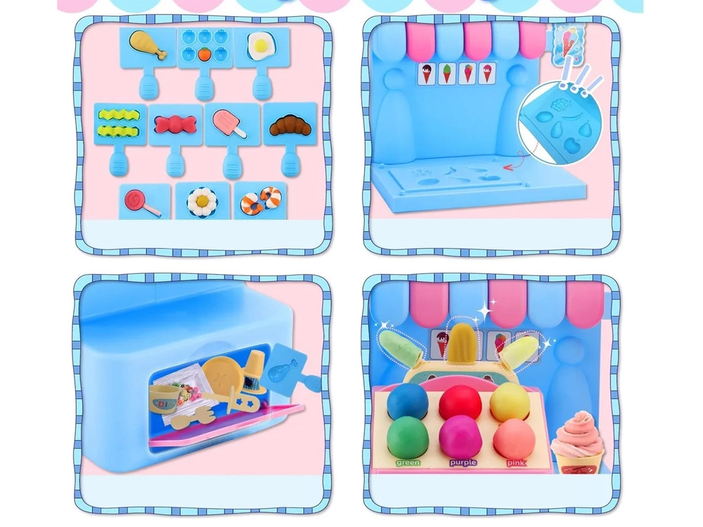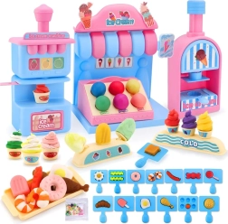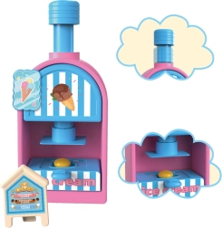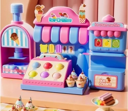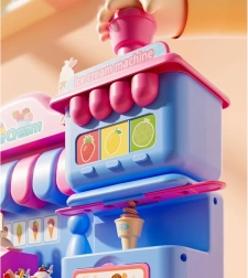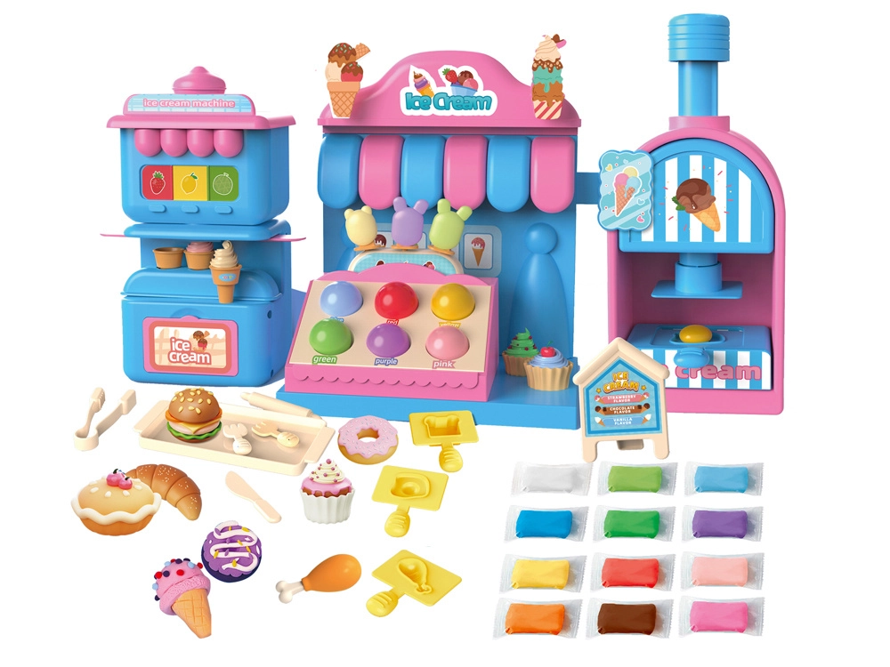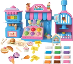 Kompleksais rotaļu komplekts ietver saldējuma mašīnu krāsainu porciju izspiešanai, pārdošanas leti gardumu izkārtošanai un presi ar “cepšanas” formu kūciņu un cepumu veidošanai. Viss saskaņots maigos rozā un zilajos toņos, lai darinājumi izskatītos kā īstā konditorejas vitrīnā.
