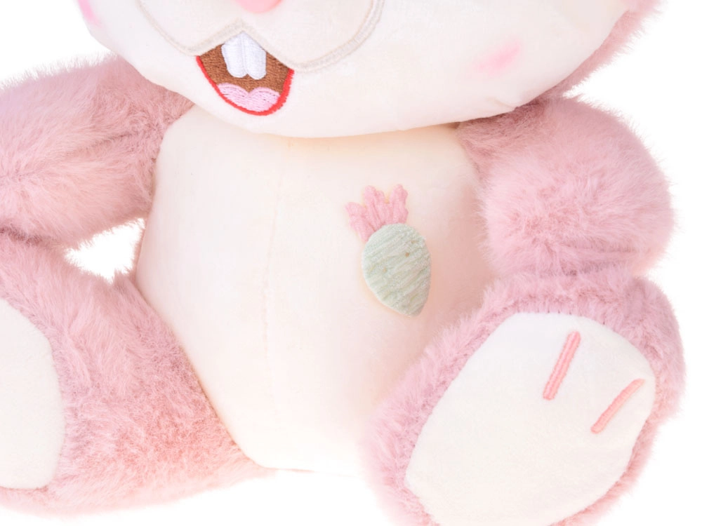 Samtaini mīksts plīša audums pūderrozā tonī ar kontrastējošu krēmkrāsas vēderiņu aicina pieglāstīties un sniedz nomierinošu pieskārienu.