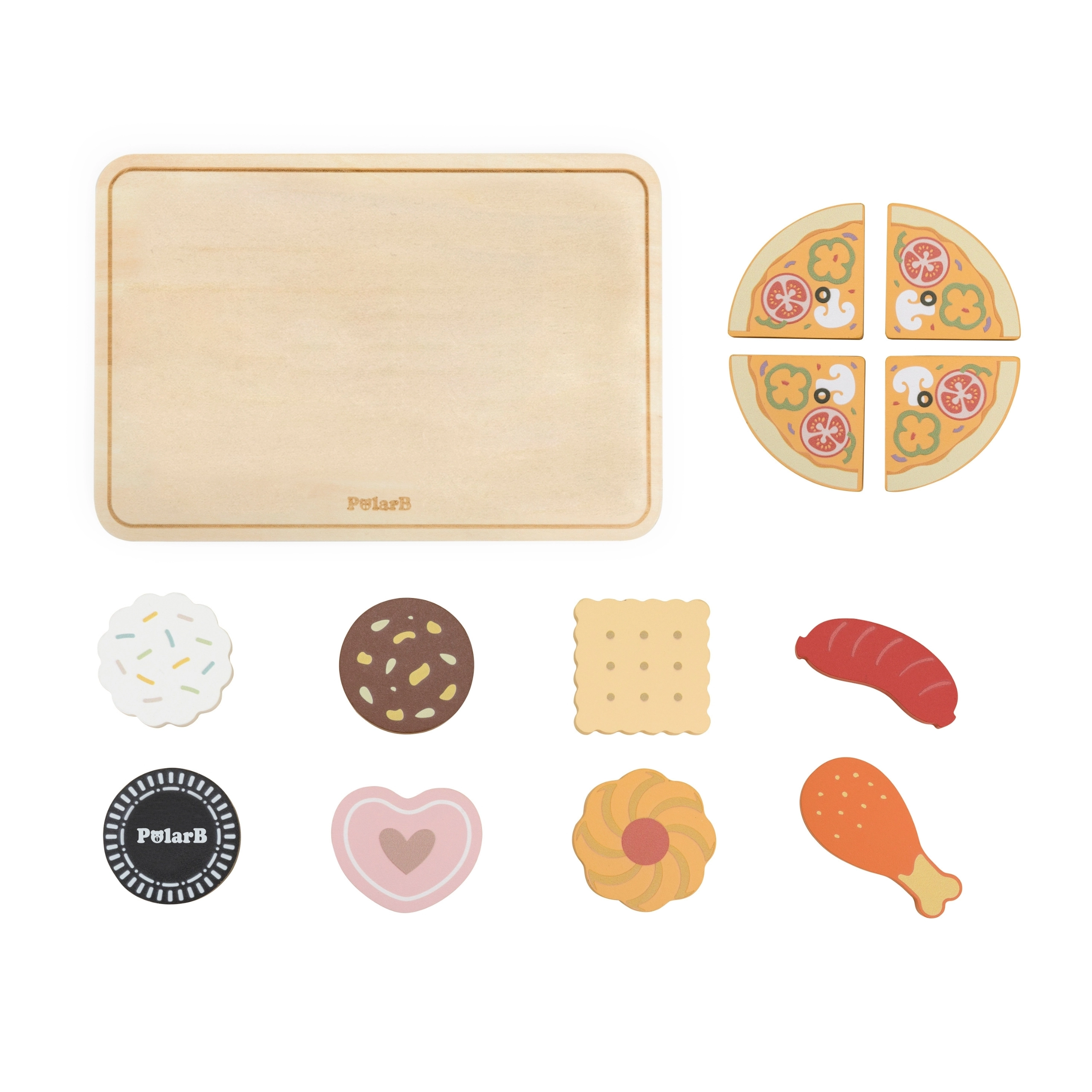 - Bagātīgs piederumu komplekts: 12 koka “pārtikas” vienības, tostarp cepumi, pica (4 daļas), desiņa un vistas stilbiņš.