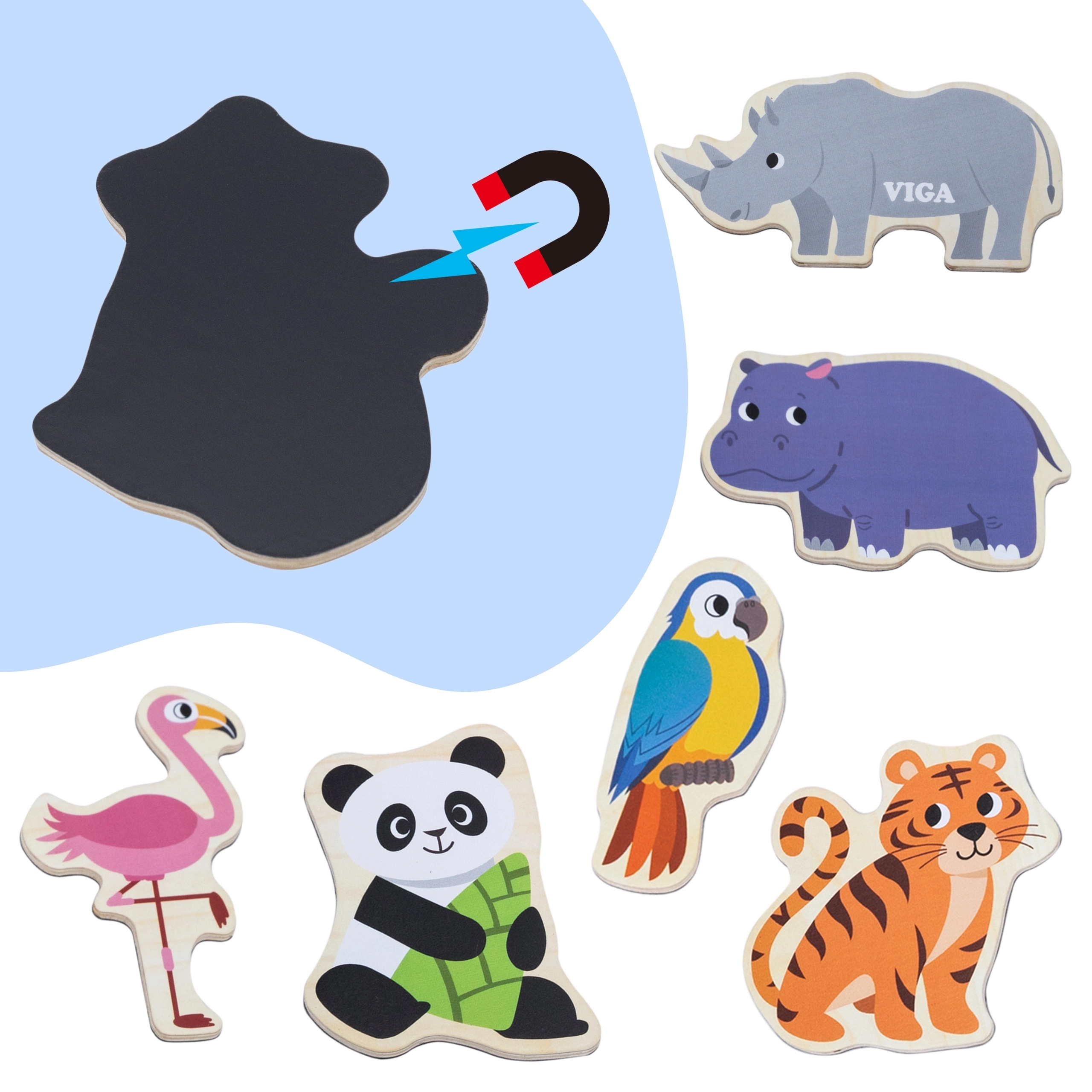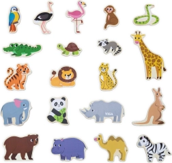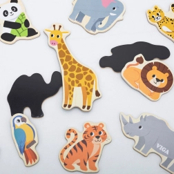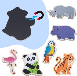 Koka magnētu komplekts VIGA – Savvaļas dzīvnieki sniedz bērniem jautru un izglītojošu izklaidi. Reālistiski ilustrēti gabaliņi, piemēram, lauva, žirafe, krokodils vai papagailis, rosina sarunas, pasaules iepazīšanu un pirmos stāstiņus. Pateicoties izturīgajai magnētiskajai kārtai, tie labi turas pie ledusskapja, magnētiskās tāfeles un citām metāla virsmām.