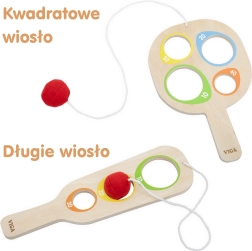 Spēle dabiski attīsta sīko motoriku, acu–roku koordināciju, telpisko uztveri un koncentrēšanos. Pateicoties mīkstajām bumbiņām un drošajam piestiprinājumam, spēle ir droša un bumbiņas nepazūd. Izturīgais koka izpildījums ar gludu virsmu patīkami guļ rokā un iztur ikdienas lietošanu.