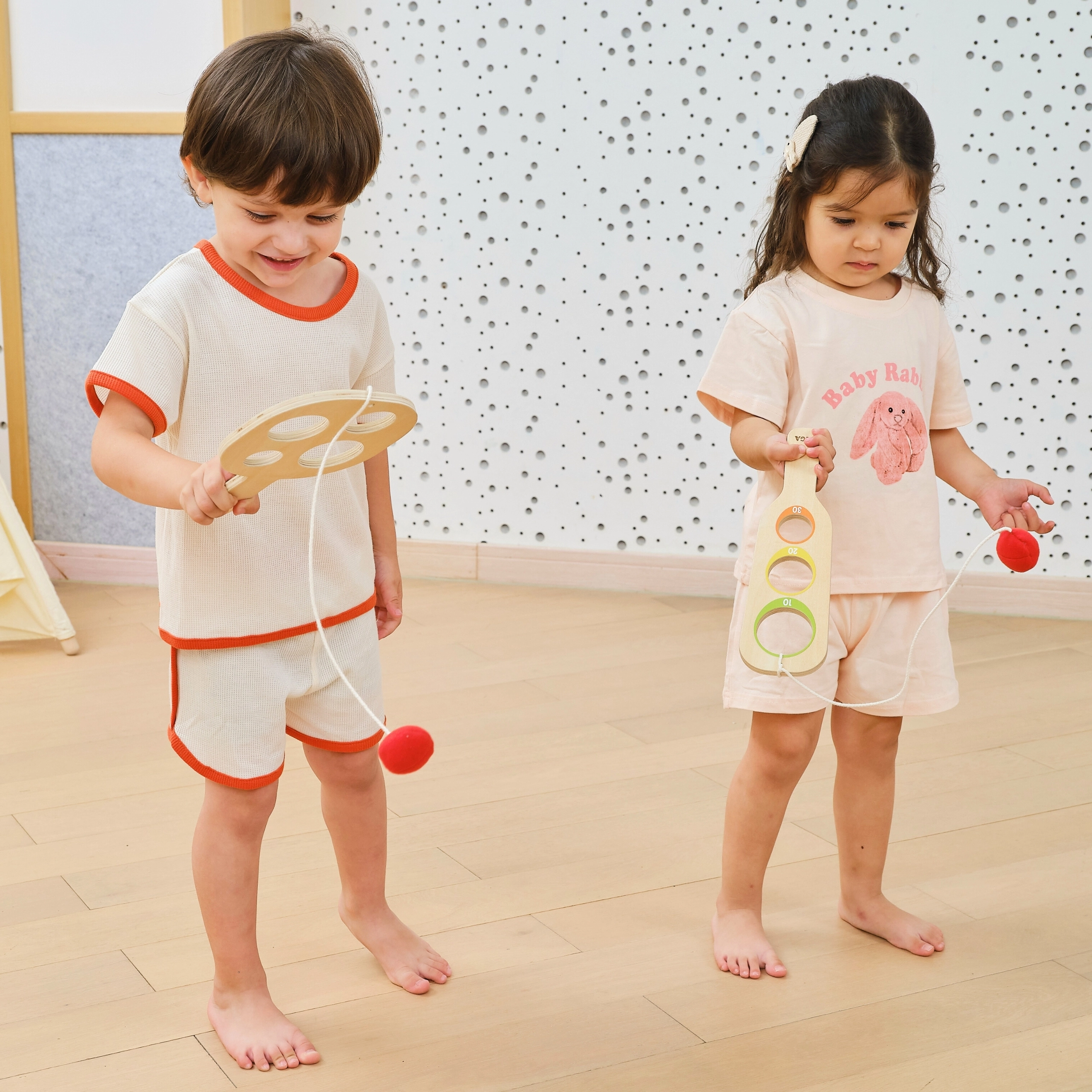 Atklājiet aizraujošu veiklības spēli, kas motivē bērnus kustēties un koncentrēties. Divas koka paletes – viena garāka, otra kompaktāka – ir ar vairākām apaļām atverēm un punktu skaitīšanu (10–50). Mērķis ir ar švunku pārvirzīt mīksto bumbiņu uz aukliņas caur pēc iespējas mazāku atveri, lai iegūtu vairāk punktu. Lieliski piemērota gan individuālai spēlei, gan draudzīgiem mini turnīriem.