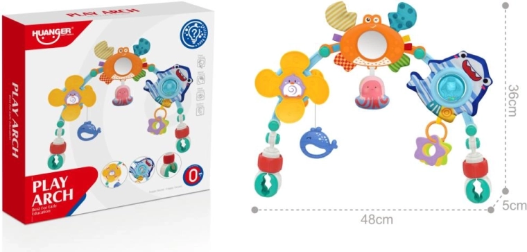 Šis universālais rotaļu loks ar jūras motīvu viegli piestiprināms pie gultiņas vai ratiņiem un nodrošina mazulim daudzveidīgu stimulāciju. Tas apvieno dažādas tekstūras, formas un funkcijas – no vējdzirnaviņām un spogulīša līdz graužamajiem riņķiem un grabulim –, kas veicina dabisku ziņkāri un acu–roku koordināciju.