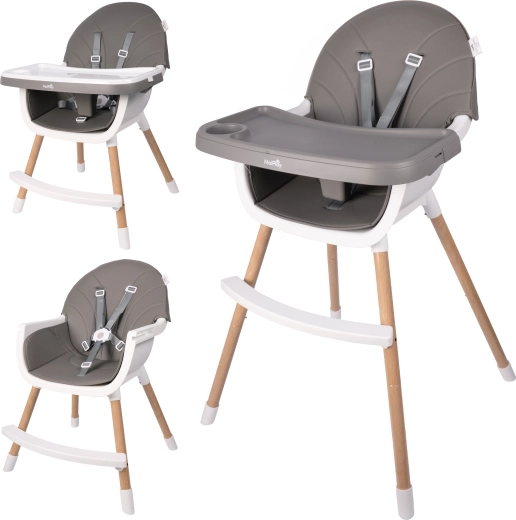 Praktiskais bērnu barošanas krēsliņš BITEO elegantā pelēkā krāsā nodrošina drošu un ērtu ēdināšanu katru dienu. Tam ir 5 punktu drošības josta, noņemams un augstumā regulējams dubultais paliktnis, regulējamas kājas un pretbuksēšanas uzgaļi. Stabilās tērauda kājas ar koka dekoru papildina mūsdienīgu izskatu un nodrošina uzticamu stabilitāti. Iepakojumā iekļauts bezmaksas priekšautiņš.