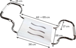 Profesionāls vannas sēdeklis ir ideāli piemērots senioriem, personām ar ierobežotām kustībām un atveseļošanās laikā. Robusta hromēta tērauda rāmis un izturīga plastmasas sēžamvirsma (aptuveni 36 × 26 cm) garantē stabilitāti un ilgmūžību. Sēdeklis vienkārši uzliekams pāri vannas malām un, pateicoties regulējamiem balstiem 42,5–65 cm, pielāgojas dažādiem platumiem.