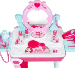 Atklājiet burvīgo grima un fantāzijas pasauli ar bērnu tualetes galdiņu koferī 2-in-1 BABY MIX. Atverot ceļojumu koferīti, tas kļūst par stabilu tualetes galdiņu ar sirds formas spoguli, kas, nospiežot, iedegas un atskaņo maigu skaņu. Rotaļlieta lieliski piemērota lomu spēlēm, attīsta sīko motoriku un bērnu radošumu.
