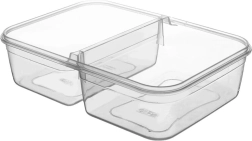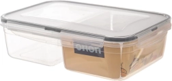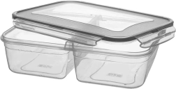 Praktisks 2 l sadalīts pārtikas trauks ar izturīgu vāku, četriem klipšiem un silikona blīvējumu, kas nodrošina nevainojamu hermētiskumu. Divas atdalītas nodalījumu sekcijas saglabā garšas un aromātus atsevišķi, trauks ir bez BPA, piemērots trauku mašīnai, mikroviļņu krāsnij (bez vāka), ledusskapim un saldētavai, un iztur temperatūras no -25 °C līdz +95 °C.