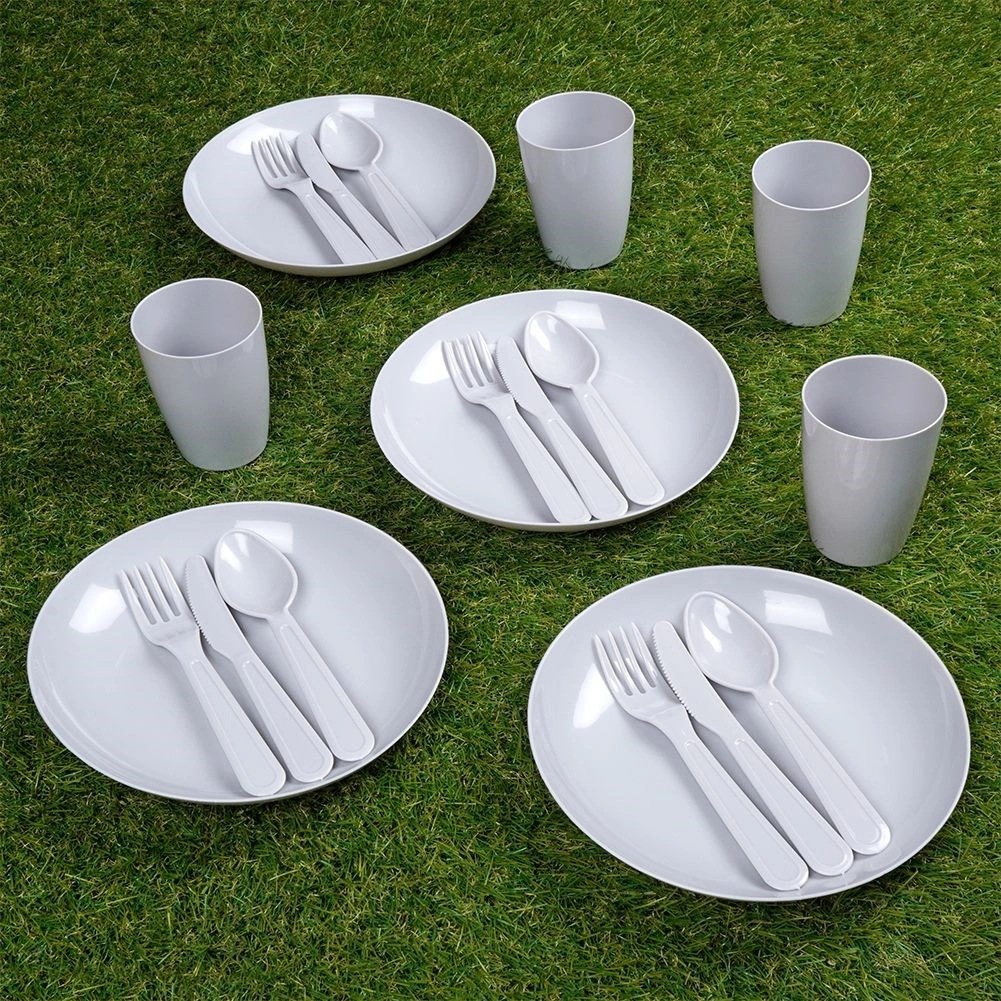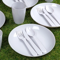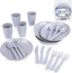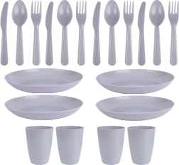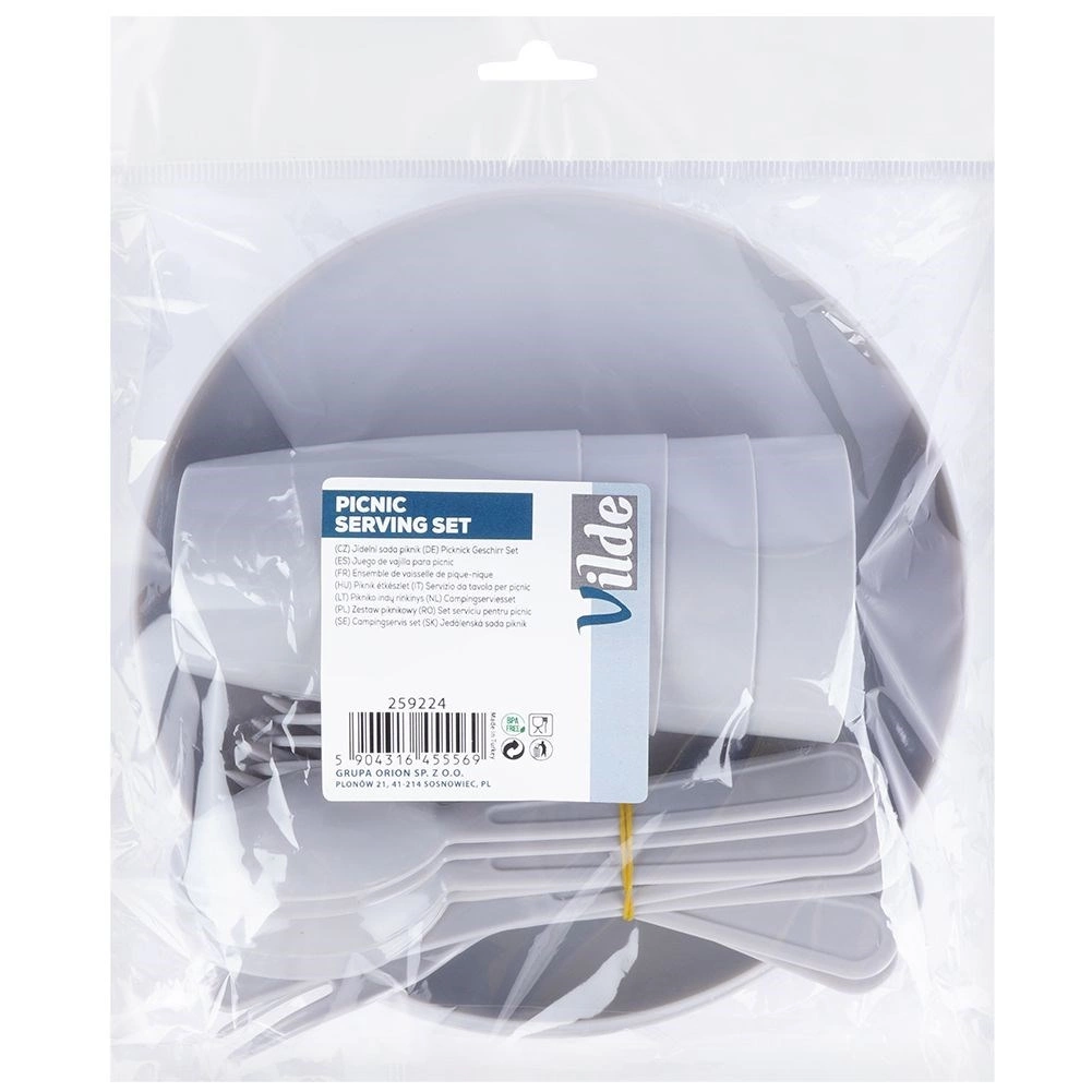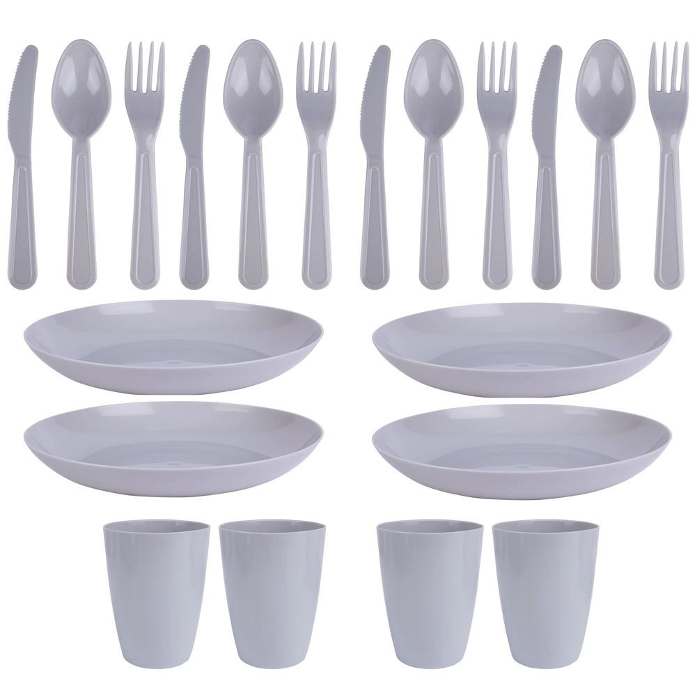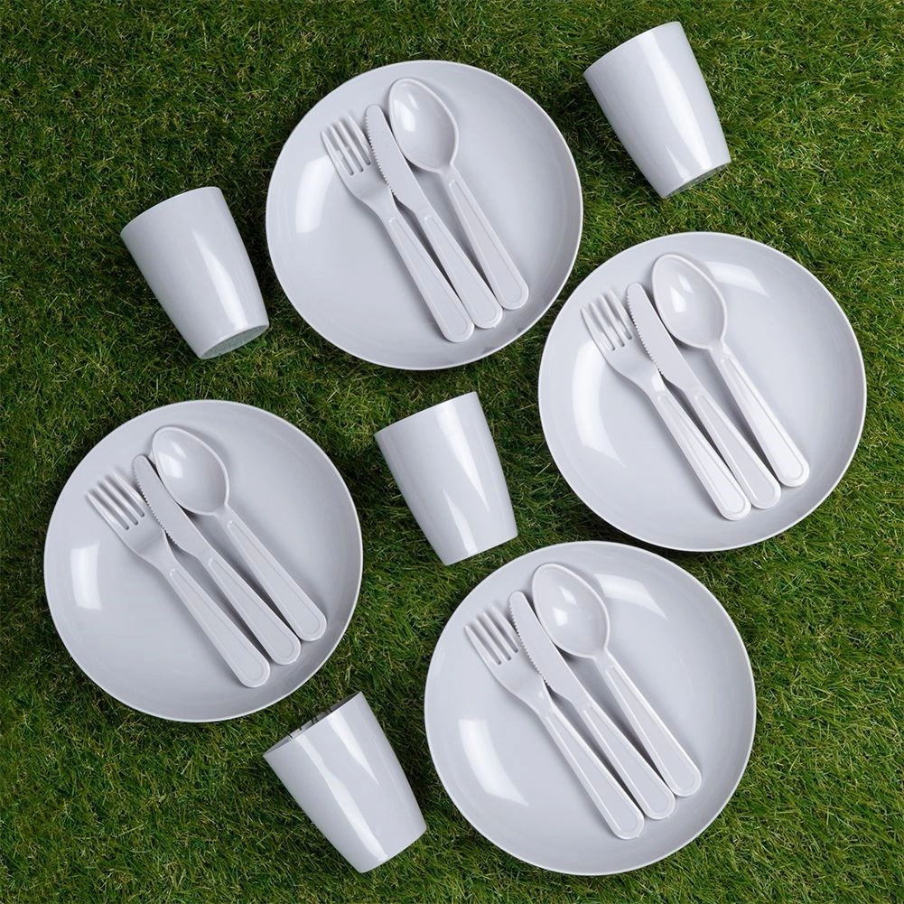 Pilns plastmasas piknika komplekts 4 personām ar kopumā 20 daļām ir ideāls izbraucieniem, dārzam un kempingam. Satur četrus glāzītes, šķīvjus un galda piederumus. Tas ir viegls, izturīgs, bez BPA un atkārtoti lietojams – lieliska alternatīva vienreizlietojamiem produktiem.
