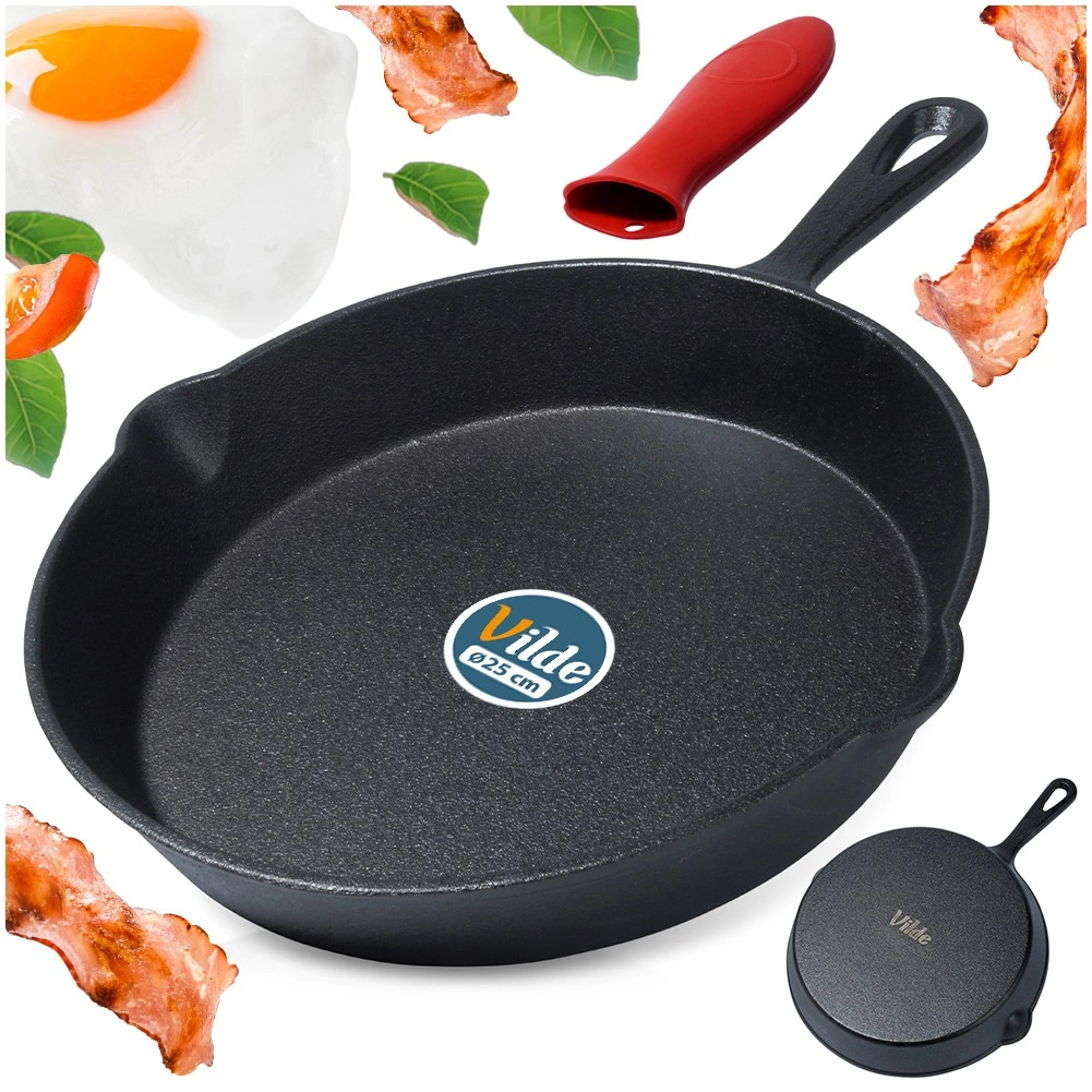 Izturīga čuguna panna ar 25 cm diametru un lielisku siltuma akumulāciju ātrai un vienmērīgai cepšanai, sautēšanai un cepšanai krāsnī. Divi ērti izliešanas snīpji atvieglo šķidrumu nolejšanu, sarkanā silikona uzmava uz roktura nodrošina drošu satvērienu. Piemērota gāzei, elektrībai, keramikai, halogēnam un indukcijai, kā arī krāsnī un uz grila.