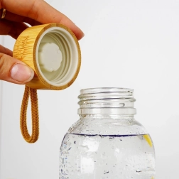 Dabīgais bambusa vāciņš ar silikona blīvgredzenu novērš noplūdi, bet tekstila siksniņa atvieglo nēsāšanu un piekari pie mugursomas.