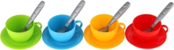 - Tējkanna, 4 tasītes, 4 apakštasītes, 4 karotītes (krāsu kombinācija)