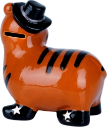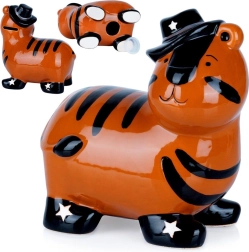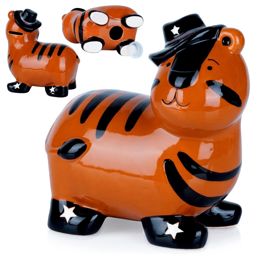 Jauka keramikas krājkase tīģera formā ar spīdīgu glazūru un stilīgu cepuri ir lieliska gan bērniem, gan pieaugušajiem. Tai ir praktisks apakšējais atvērums ar korķi, lai viegli izņemt uzkrājumus, un tā kļūs par jautru interjera dekoru. Izturīga keramika, košas krāsas un droša monētu un banknošu glabāšana padara šo krājkasi par ideālu dāvanu jebkuram notikumam.