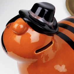 Šī keramikas krājkase tīģera formā apvieno funkcionalitāti un dekoratīvu izskatu. Spīdīga oranža virsma ar melnām svītrām, cepuri un zvaigznēm uz kurpēm piešķir rotaļīgu raksturu, kas iedzīvinās gan bērnu istabu, gan modernu interjeru. Pateicoties apakšējam atvērumam ar izņemamu korķi, uzkrājumus var izņemt atkārtoti bez salaušanas.