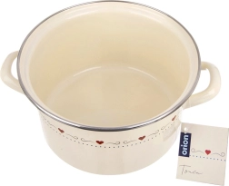 Stilīgs emalēts katls TONCA ar tilpumu 4 l un diametru 22 cm krēmkrāsā ar smalku sirsniņu motīvu ir ideāli piemērots ikdienas vārīšanai un sautēšanai. Tam ir izturīgi ergonomiski rokturi, nerūsējoša tērauda apmale un tas ir piemērots visiem plīts veidiem, tostarp indukcijai, kā arī krāsnij. Vienkāršai kopšanai to var mazgāt trauku mazgājamajā mašīnā.