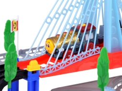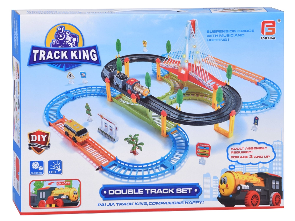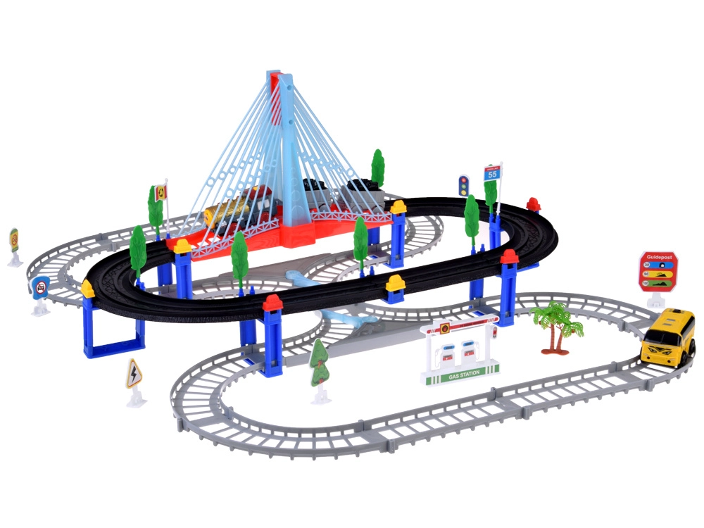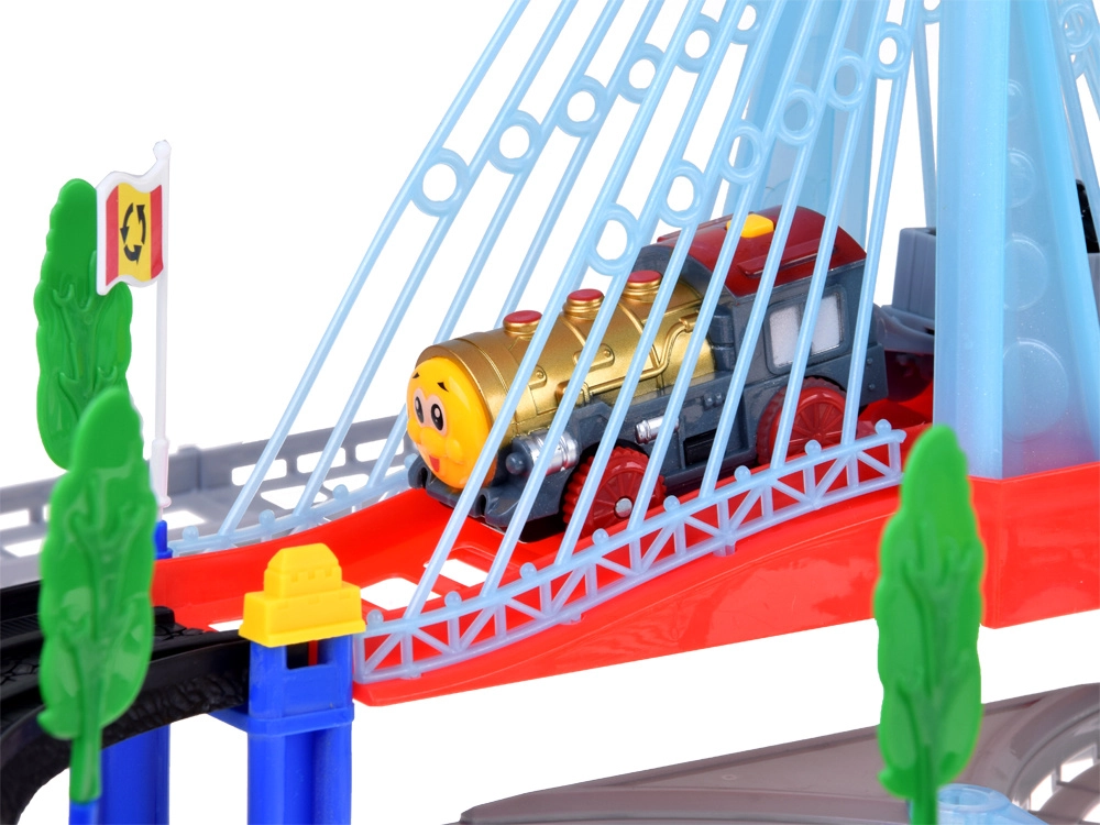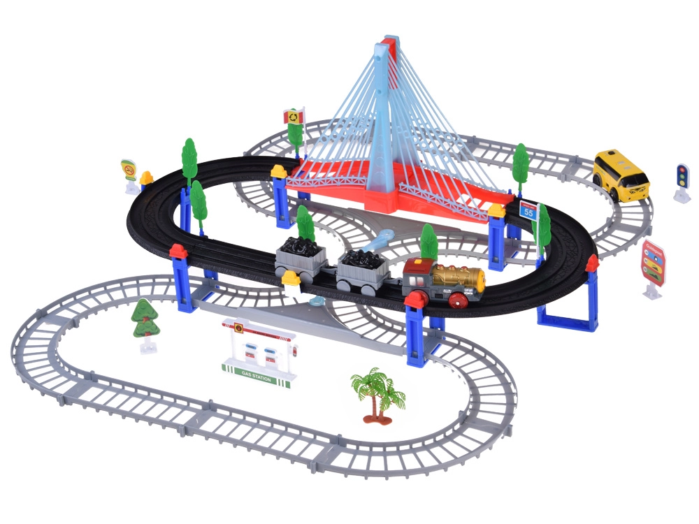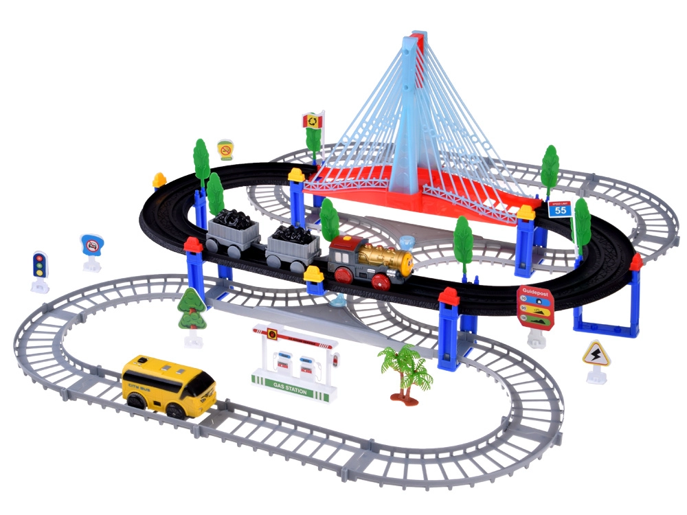 Šī elektriskā vilciena trase ar daudzlīmeņu sliedēm un piekares tiltu sniedz bērniem stundām ilgu radošu rotaļu. Lokomotīve ar vagoniem un dzeltenais pilsētas autobuss pārvietojas pa savstarpēji savienotām trasēm, šķērso tiltu un brauc garām ceļa zīmēm, kociņiem un nelielai degvielas uzpildes stacijai. LED apgaismojums un lokomotīves skaņas ar melodijām piešķir spēlei autentiskumu.
