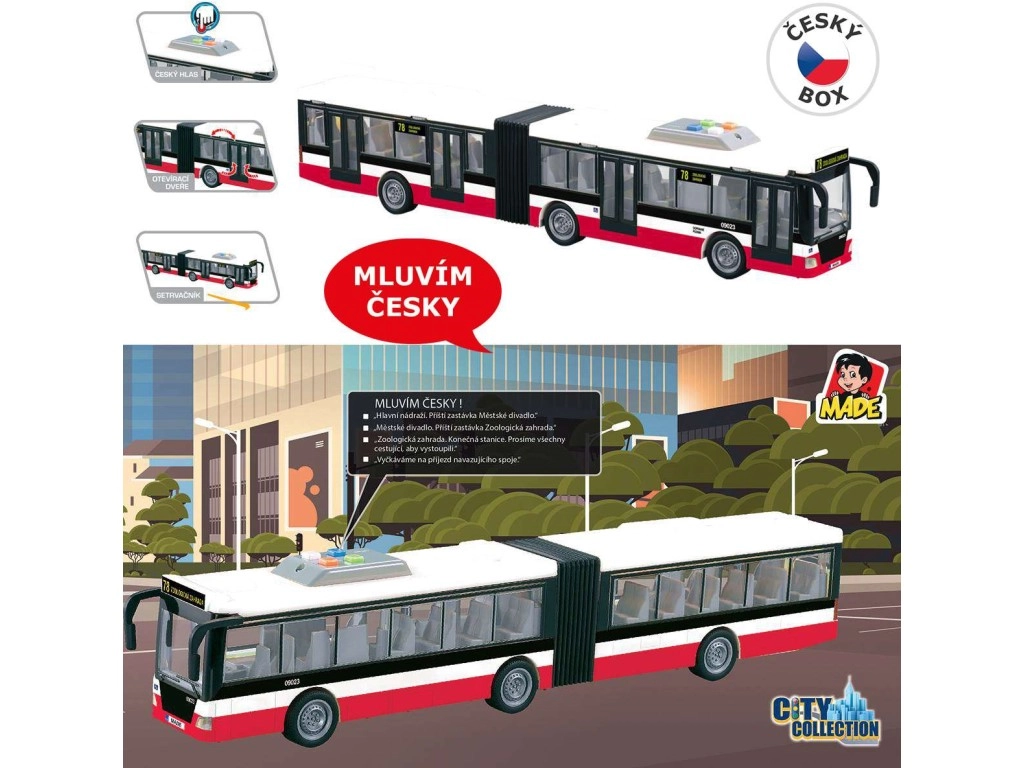 Šis detalizēti izstrādātais locītais autobuss bērniem sniedz reālistisku sabiedriskā transporta pieredzi. Pateicoties inerces piedziņai, tas viegli ierosinās kustību, un gaismas papildinājumi kopā ar čehu pieturu paziņojumiem pastiprina spēli un attīsta iztēli.