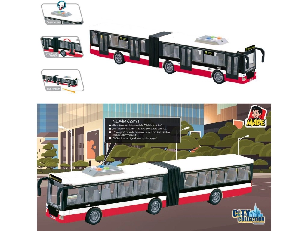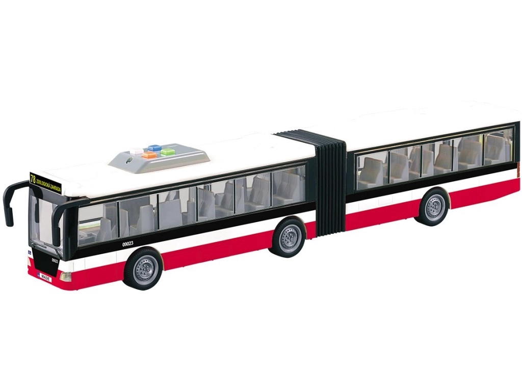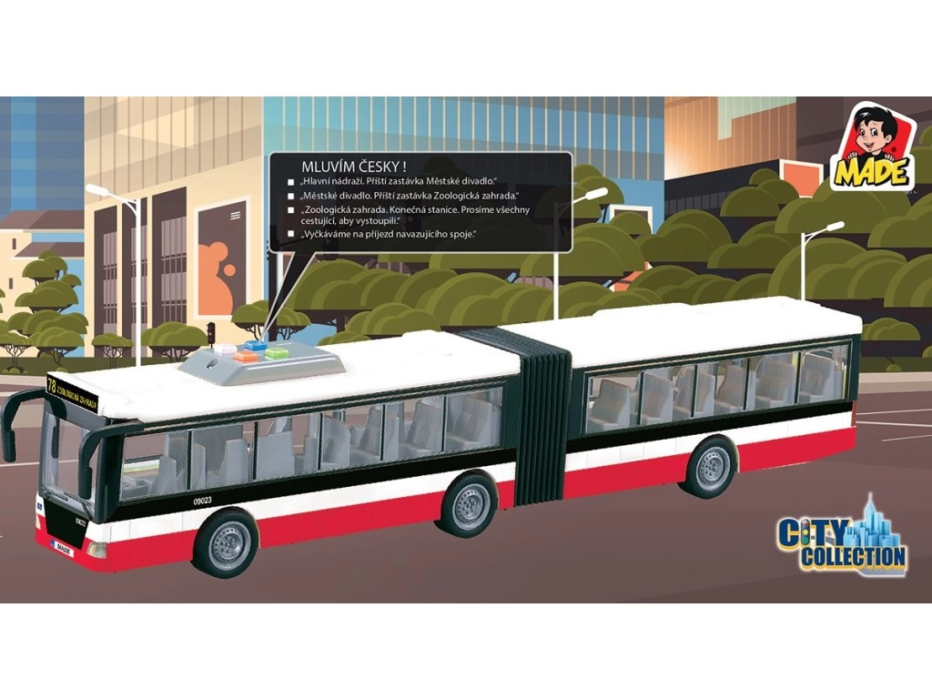 Locītais pilsētas autobuss ar inerces piedziņu ar gaismas efektiem un čehu pieturu paziņojumiem iepriecinās visus mazos vadītājus. Tas piedāvā elastīgu locījumu, reālistisku CZ dizainu un ir gatavs braukšanai uzreiz pēc izsaiņošanas, pateicoties baterijām komplektā.